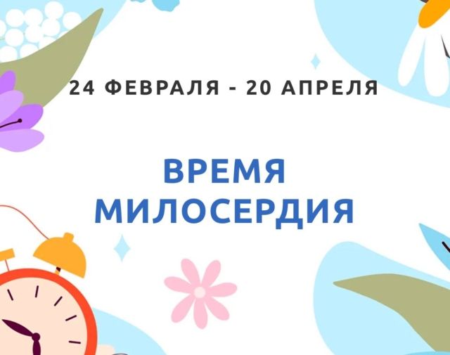 Синодальный отдел по церковной благотворительности социальному служению запустил акцию «Время милосердия». Акция началась 24 февраля, на первой неделе Великого поста, и продлится до 20 апреля, конца Светлой седмицы.