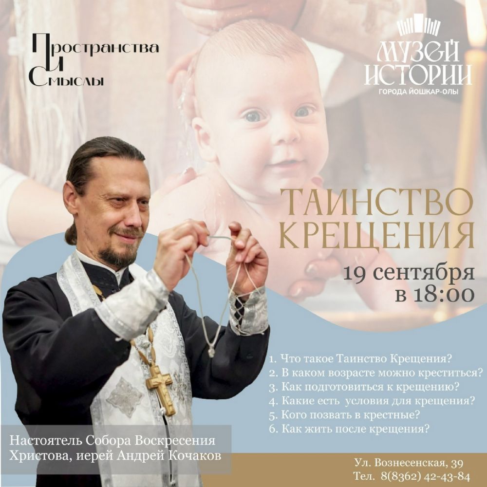 Дорогие друзья! Осень – время для размышлений, поиска новых знаний и ответов на вечные вопросы. Музей истории города Йошкар-Олы приглашает вас на новую встречу в рамках проекта «Пространства и смыслы». Сезон начинается с важной темы – Таинство Крещения.