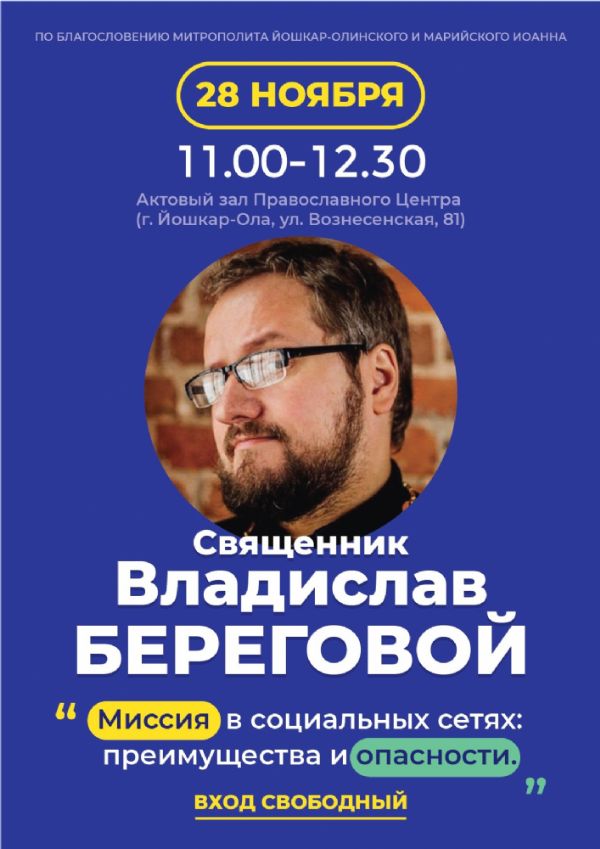 28 ноября в актовом зале Православного центра по благословению митрополита Йошкар-Олинского и Марийского Иоанна состоится встреча с известным блогером, интернет-миссионером священником Владиславом Береговым.