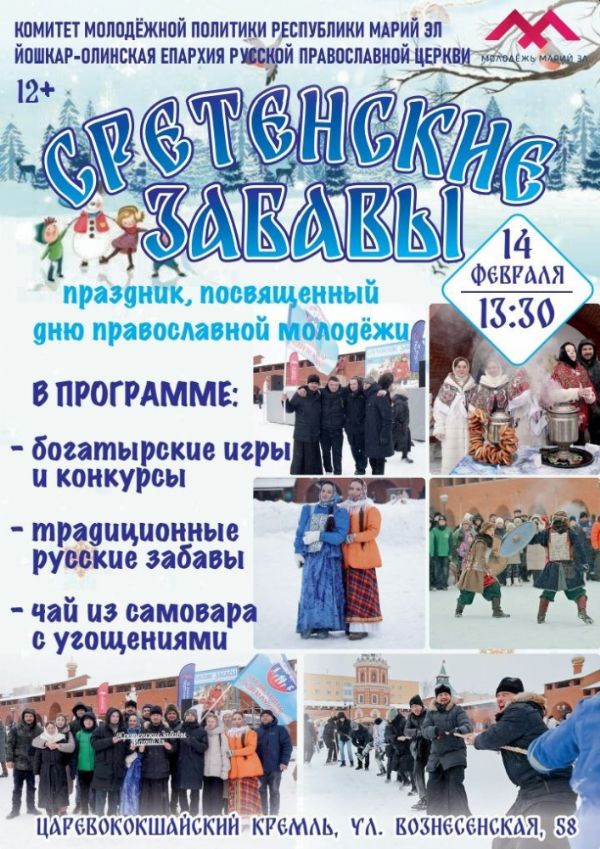 14 февраля в Йошкар-Оле, в Царевококшайском кремле пройдут традиционные «Сретенские забавы», приуроченные ко Дню православной молодежи. Начало в 13:30.
