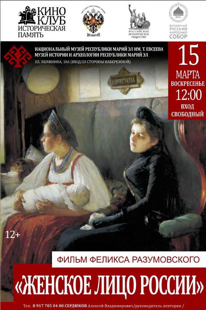 15 марта (воскресенье) в 12:00 в Музее истории и археологии (Йошкар-Ола, ул. Эшкинина, дом 10-а, вход со стороны набережной) состоится показ историко-документального фильма Феликса Разумовского «Женское лицо России».