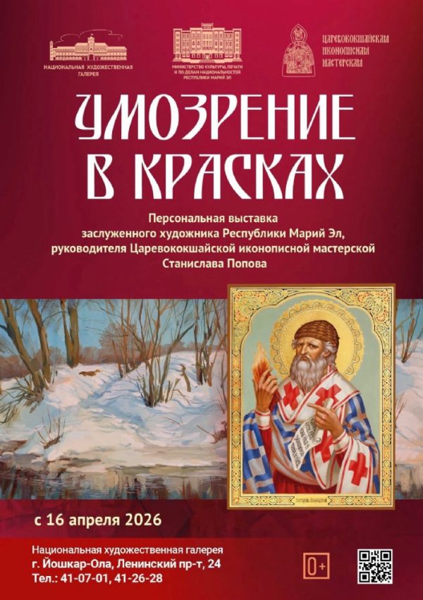 16 апреля Национальной художественной галерее открывается персональная выставка «Умозрение в красках». Выставочный проект посвящён 55-летию со дня рождения заслуженного художника Республики Марий Эл Станислава Валентиновича Попова, члена Союза художников России, основателя и руководителя Царевококшайской иконописной мастерской.