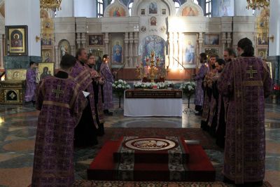 Вечером 26 апреля митрополит Йошкар-Олинский и Марийский Иоанн в кафедральном соборе Благовещения Пресвятой Богородицы совершил утреню Великой Субботы - Погребение Плащаницы.