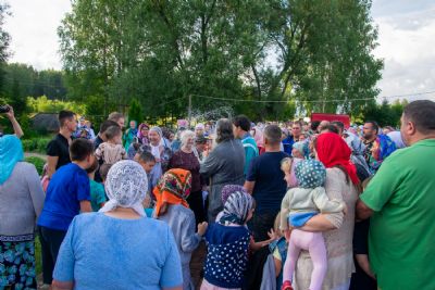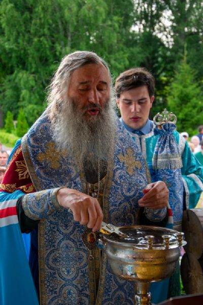 После чтения акафиста Пресвятой Богородице священство совершило освящение воды в приготовленных сосудах и на источнике. С молитвой к Божией Матери Владыка и иерей Владимир Каплунов окропили святой водой многочисленных паломников, приехавших в это святое место.