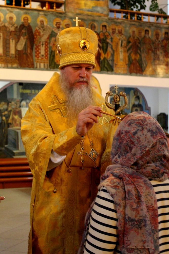 Накануне, 14 сентября, епископ Феофан совершил всенощное бдение в Никольском кафедральном соборе г. Волжска. Его Преосвященству сослужили клирики собора. На утрене владыка совершил помазание елеем верующих, молившихся за богослужением.