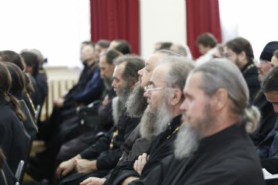 После соборного богослужения в Мироносицком женском монастыре села Ежово, священнослужители и представители приходов собрались в актовом зале Православного центра.