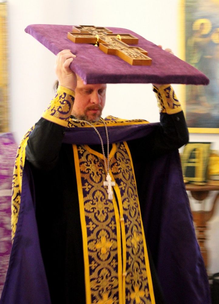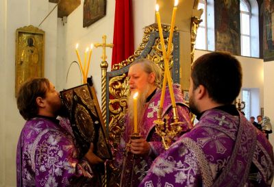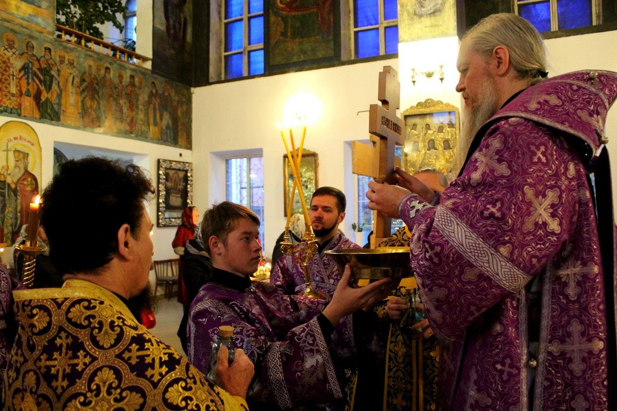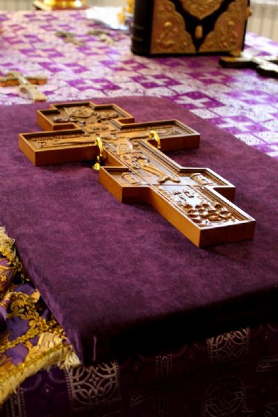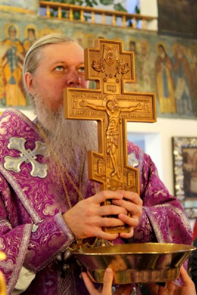 В завершение пения великого славословия архипастырь в сопровождении сослужащих священников торжественно вынес крест на середину храма. Владыка Феофан совершил чин воздвижения Креста Господня.