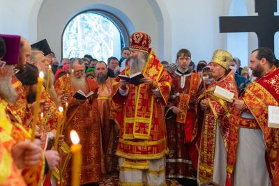 Богослужение началось пением пасхального часа. Затем духовенство вышло в притвор храма для встречи архиерея. За Литургией возносились особые прошения о единении Православной Церкви, мире в Украине, прекращении пагубного поветрия и упокоении души новопреставленного схиархимандрита Лаврентия.
