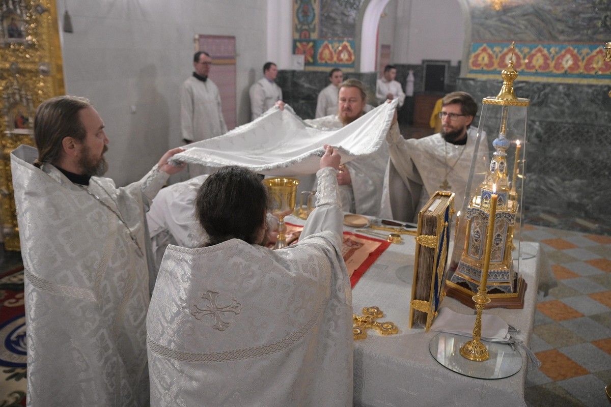Владыке сослужили секретарь Йошкар-Олинского епархиального управления иеромонах Серафим (Пасанаев), ключарь собора протоиерей Сергий Поглазов, клирики собора иереи Никифор Захаров, Евгений Самойлов, диаконы Андрей Дружинин, Игорь Коваль и клирик храма Рождества Пресвятой Богородицы с. Семеновка протодиакон Михаил Козловский.