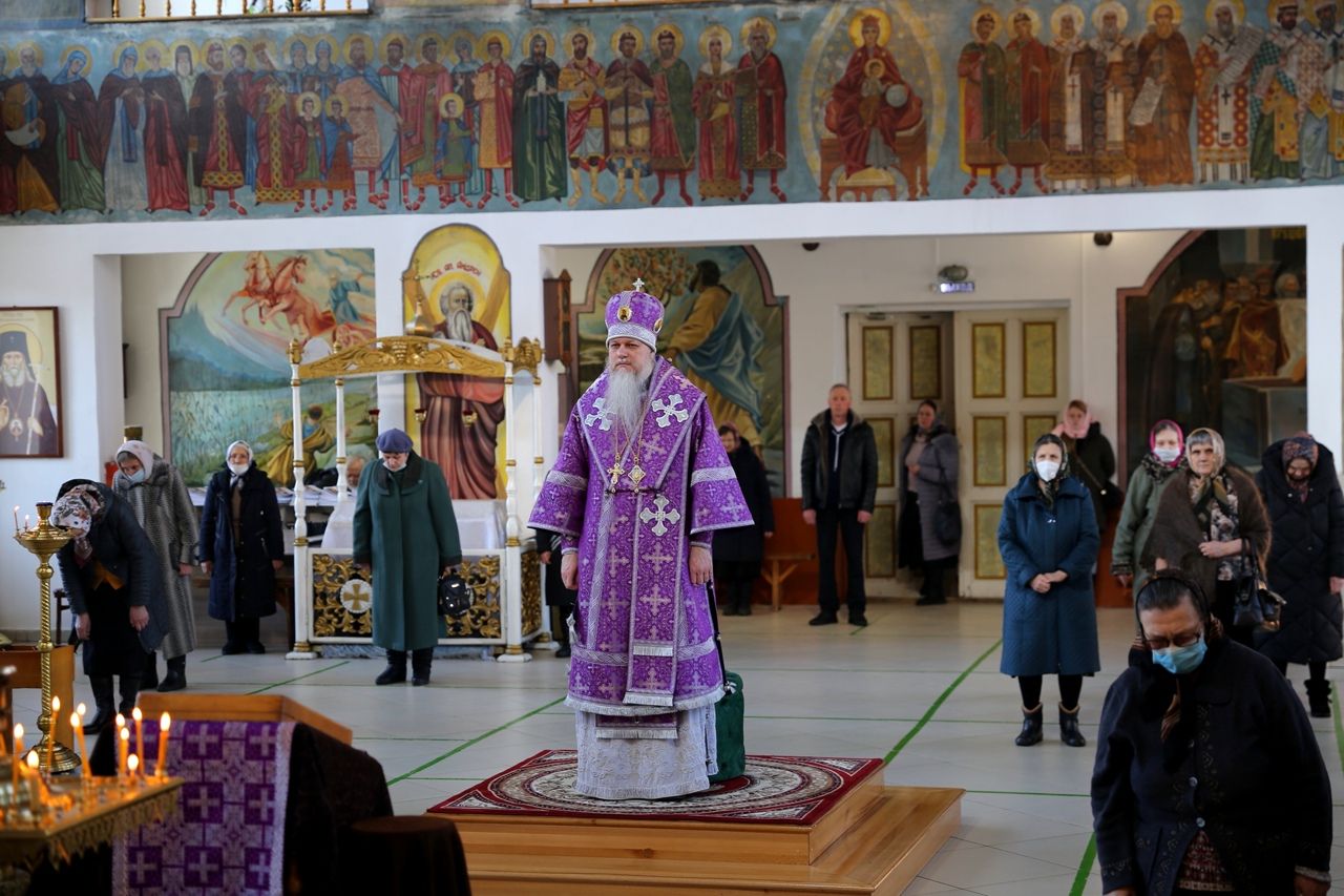 Его Преосвященству сослужили клирики кафедрального собора. Песнопения исполнял архиерейский хор.