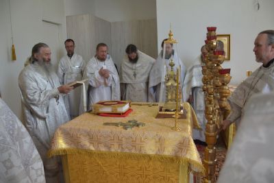 После облачения в центре храма, владыка возглавил чин великого освящения храма. В алтаре были освящены престол и жертвенник. Священники помазали с четырех сторон стены храма миром, окропили святой водой, а архипастырь прокадил весь храм ладаном. Одним из священнодействий был крестный ход со святыми мощами вокруг храма. По окончании чина освящения храма была совершена первая Божественная литургия на новоосвященном престоле.