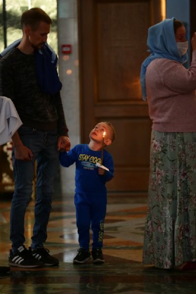 После великого славословия при пении «Трисвятого» Плащаница с изображением Пресвятой Богородицы была обнесена крестным ходом вокруг собора и унесена в алтарь, где и будет пребывать до отдания праздника Успения.