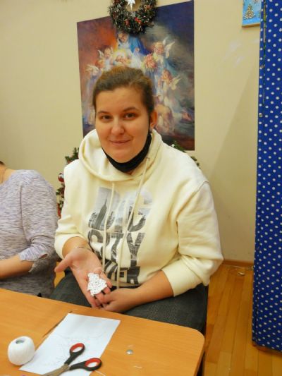 В это время дети занимались лепкой – изготовляли новогоднюю снежинку, а в перерывах для отдыха радостно участвовали в играх, которые подготовили для них добровольцы.