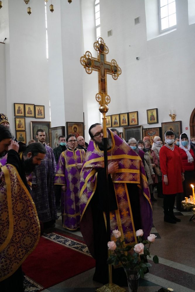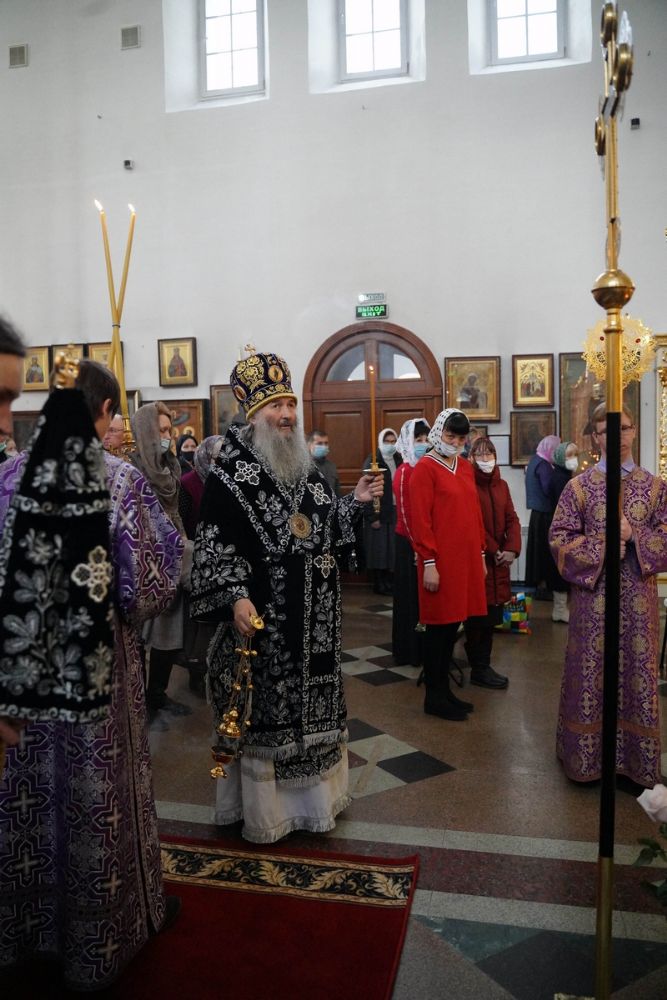 Владыке сослужили клирики храма и протодиакон Михаил Козловский. Песнопения исполнял хор храма под управлением регента Наталии Поповой.
