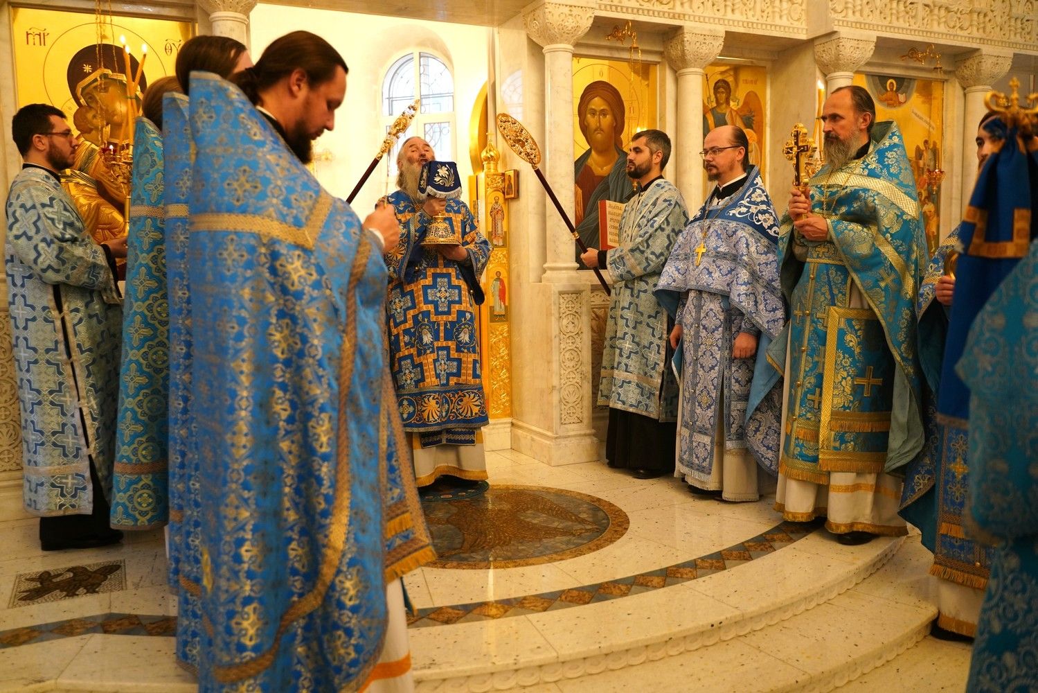 По окончании всенощного бдения крестный ход с Мироносицкой иконой Богородицы продолжился и, обойдя вокруг домового храма, отправился к Вознесенскому собору, где святыню встретили духовенство и прихожане собора.