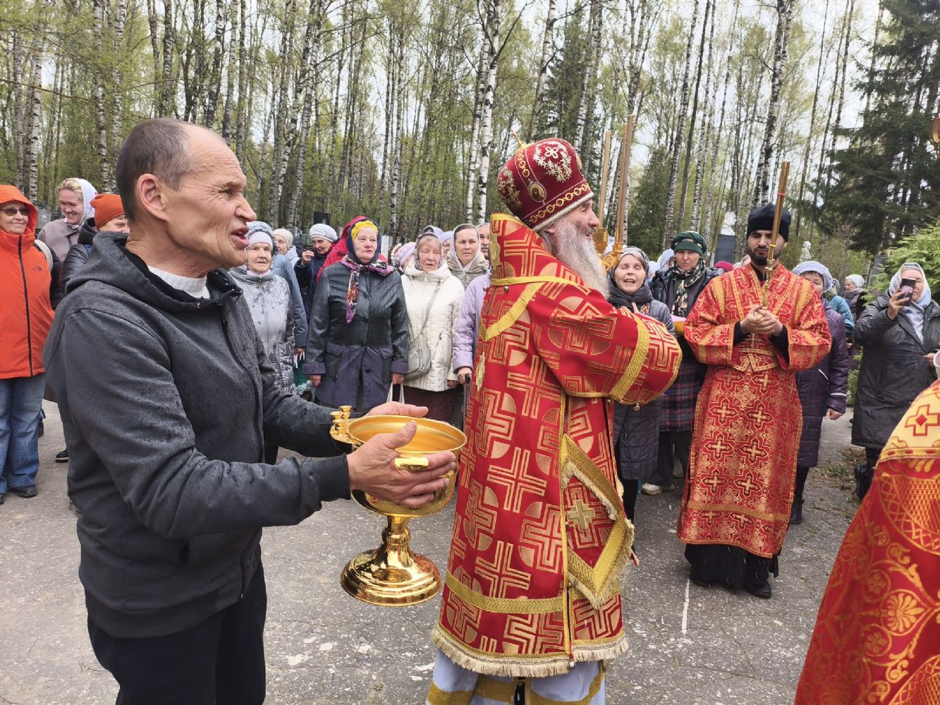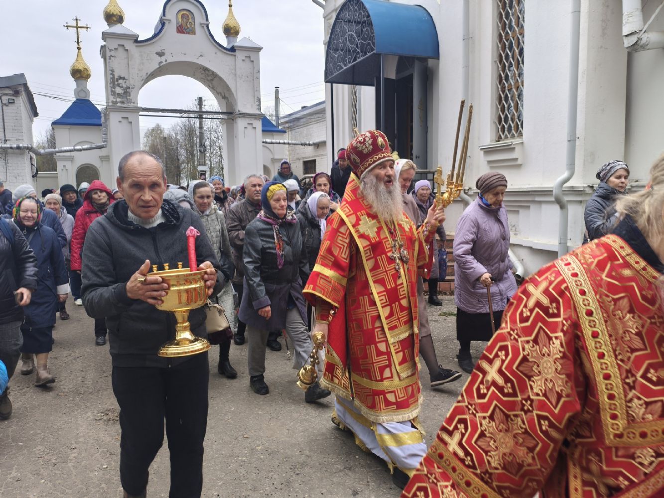 После Литургии была совершена панихида с поминовением усопших, затем под пение пасхальных стихир прошел крестный ход вокруг храма с кроплением святой водой.