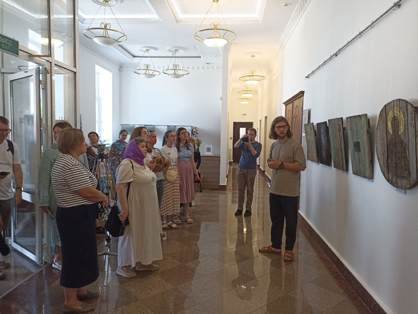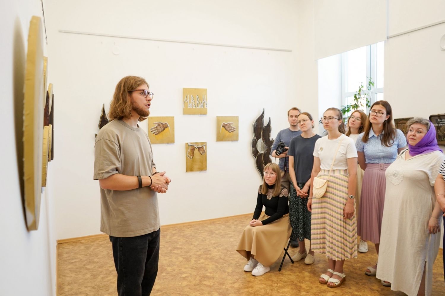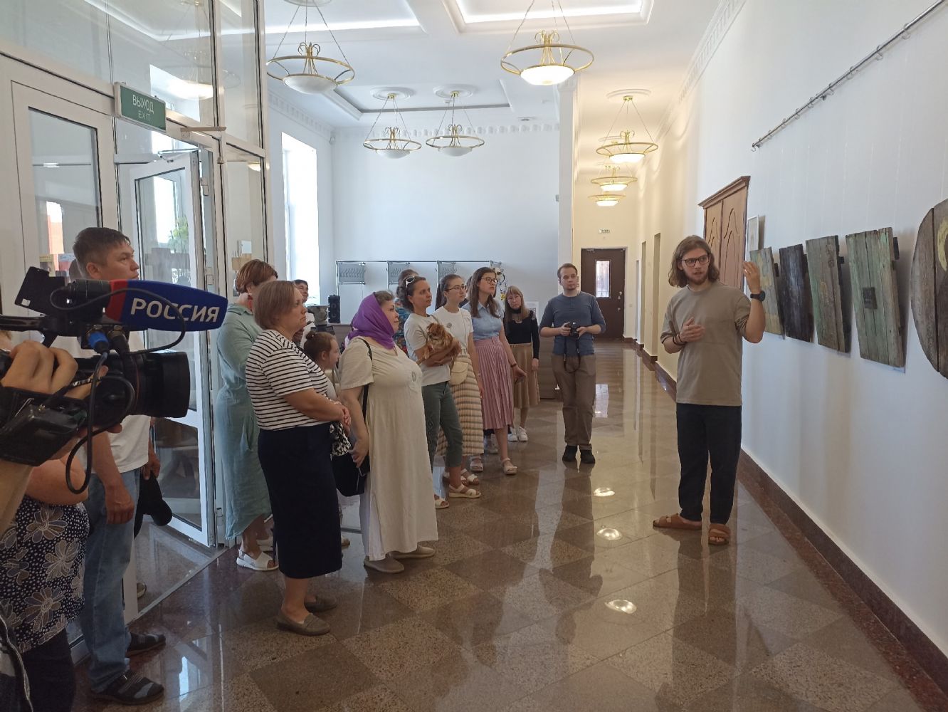 Далее художник Максим Демин провел для присутствующих авторскую экскурсию по экспозиции, рассказав о своих замыслах, о глубинном смысле, отраженном в представленных работах.