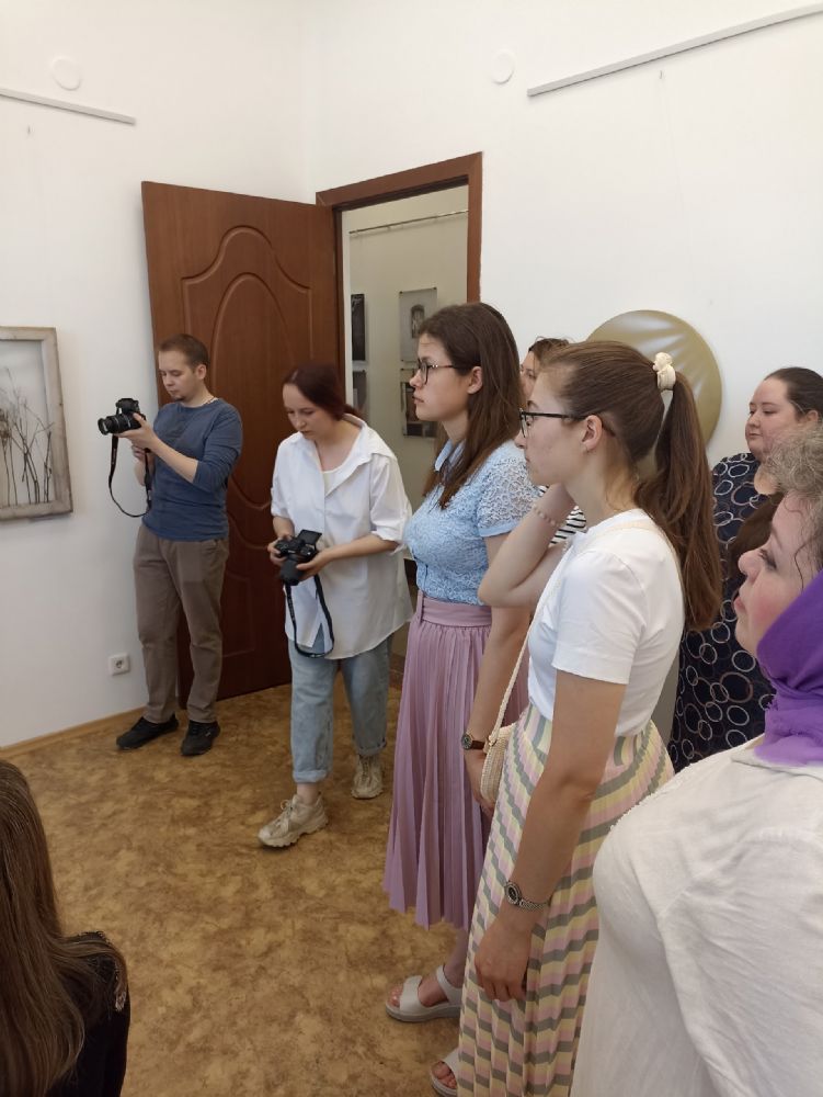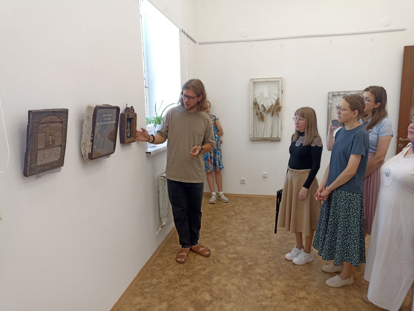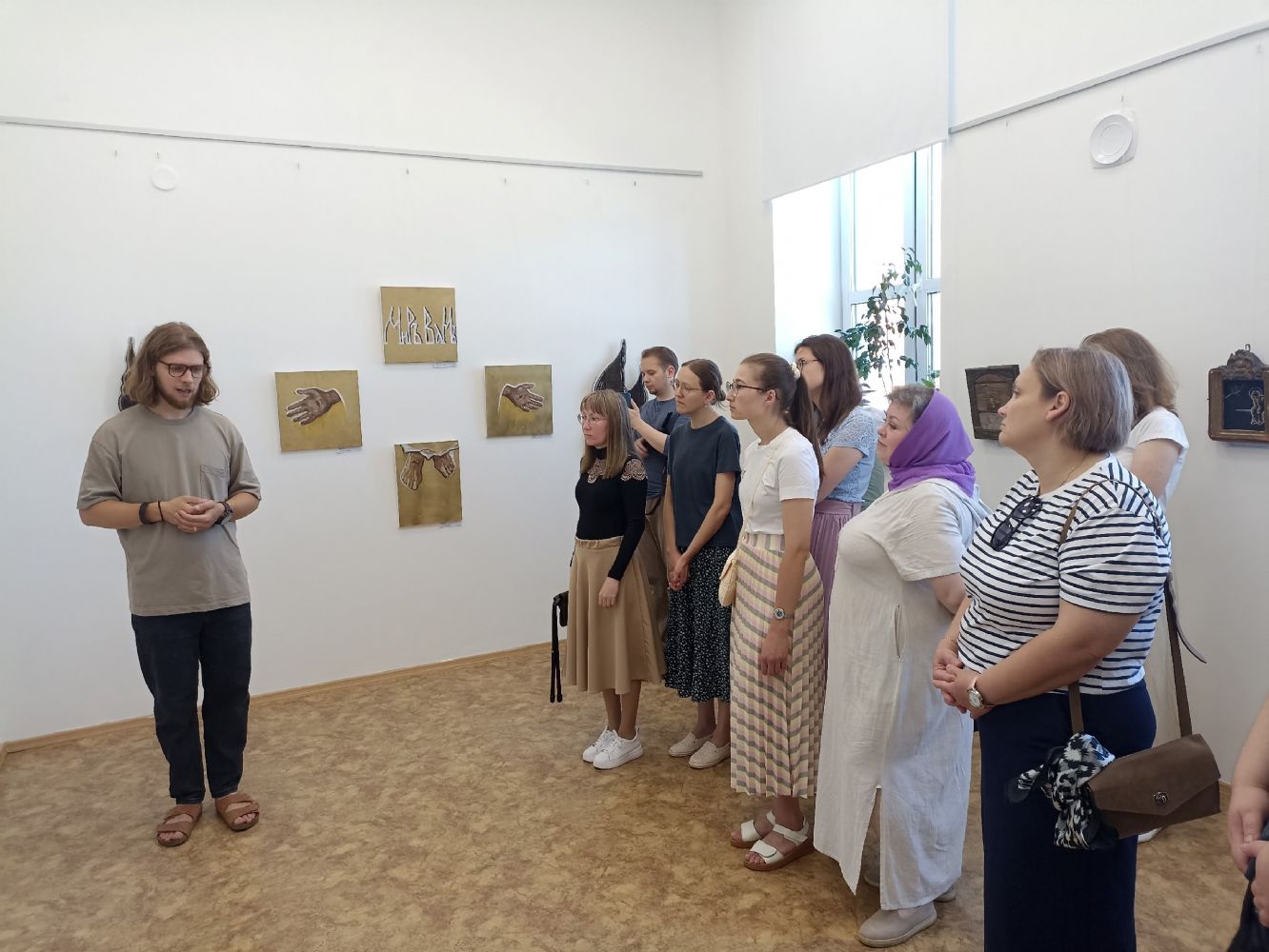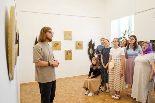 Далее художник Максим Демин провел для присутствующих авторскую экскурсию по экспозиции, рассказав о своих замыслах, о глубинном смысле, отраженном в представленных работах.