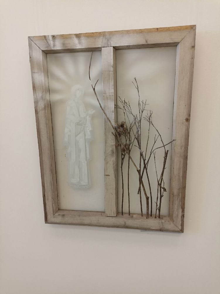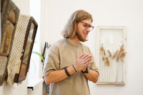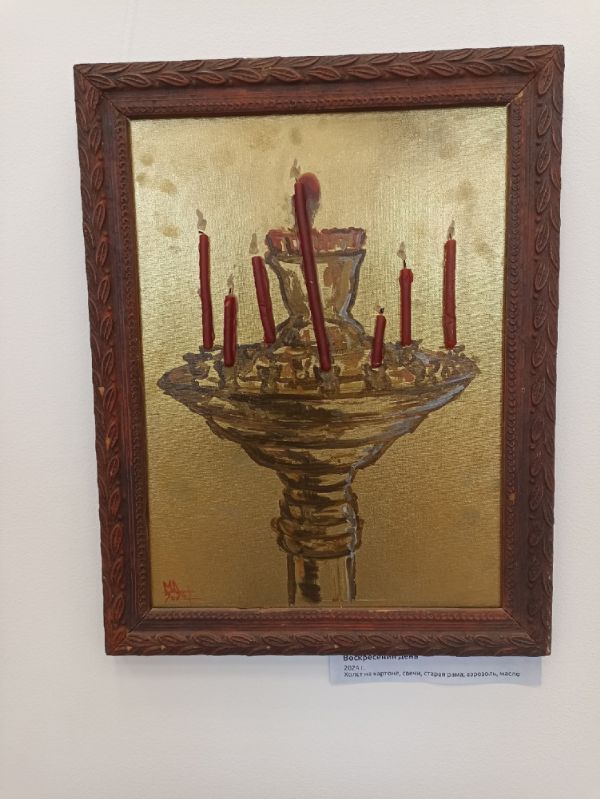 Максим продолжительное время работал в музейной среде реставратором станковой темперной и масляной живописи. И его работы – очень нестандартные и интересные. Традиционные холст и масло сочетаются с обожженным старинным деревом, аэрозольным напылением, вставками из сухоцветов и даже археологическими артефактами… А оригинальная инсталляция «Письмо от Бога», где с потолка на леске свисают конверты с QR-кодами, предлагают зрителям перейти по ним – и получить цитату из Священного Писания, в которой Бог обращается к человеку. При желании можно написать в ответ свою записку и вложить ее в этот конверт.