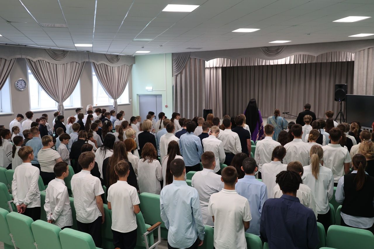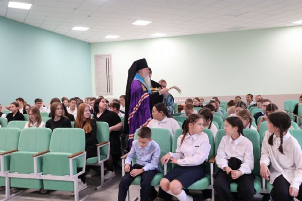 «Дорогие братья и сестры! Мне хотелось бы всех вас поздравить с началом учебного года и вспомнить слова Святейшего Патриарха Московского и всея Руси Кирилла, который говорит о том, что мы должны постоянно совершенствоваться в своем познании и духовной жизни, и земных наук. Вы пришли в школу для того, чтобы здесь получить знания о земной жизни, но образование происходит от слова «образ». И мы с вами все сотворены Богом по Его образу и подобию, и должны постараться уподобиться Богу в нашей душе.