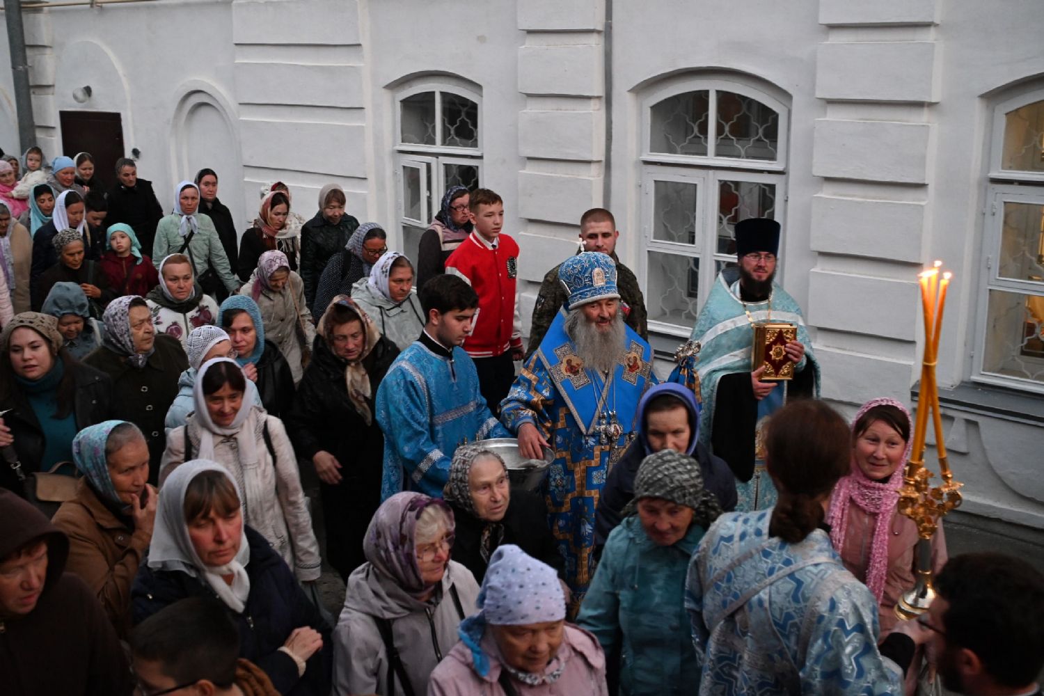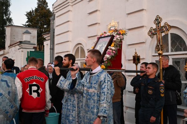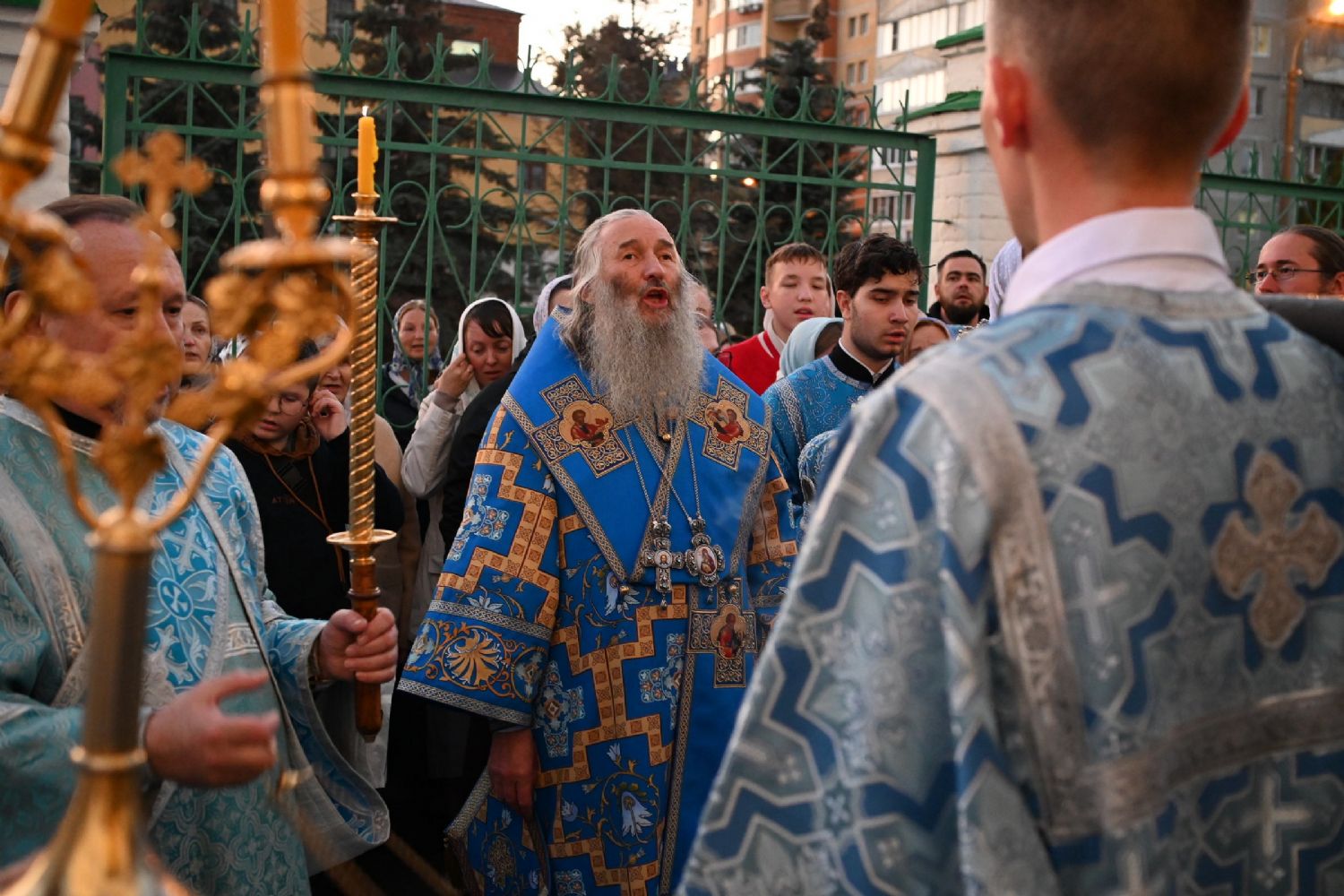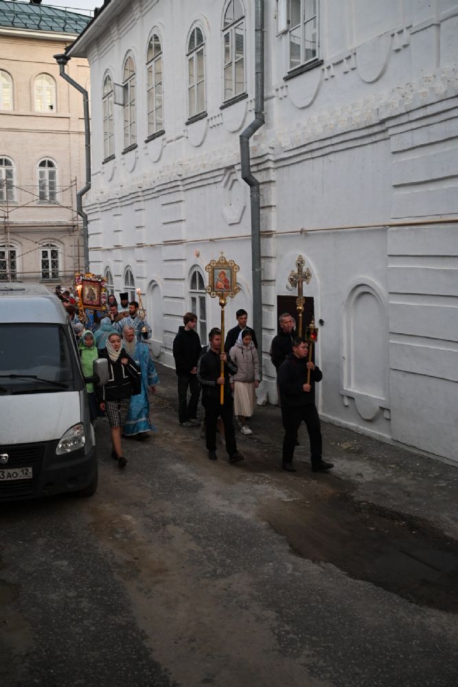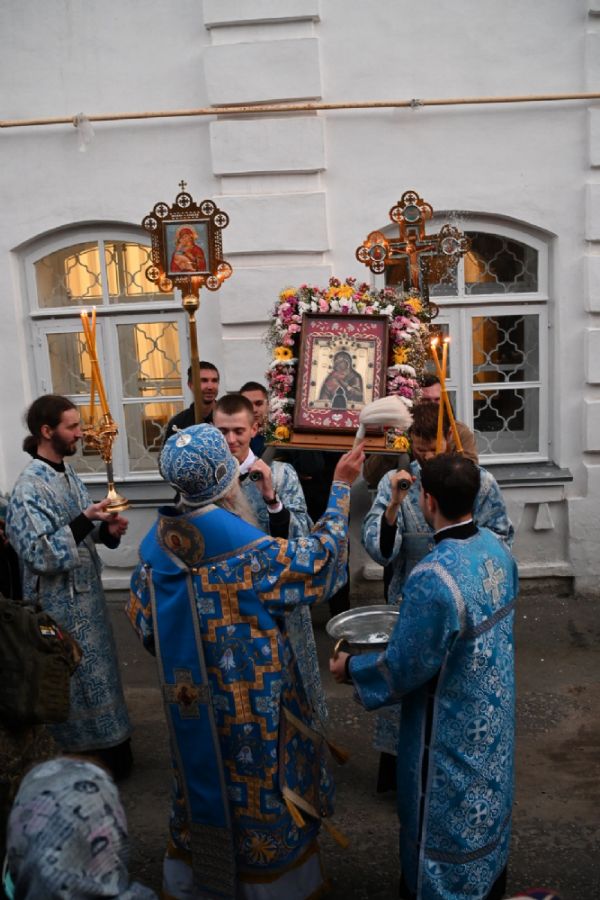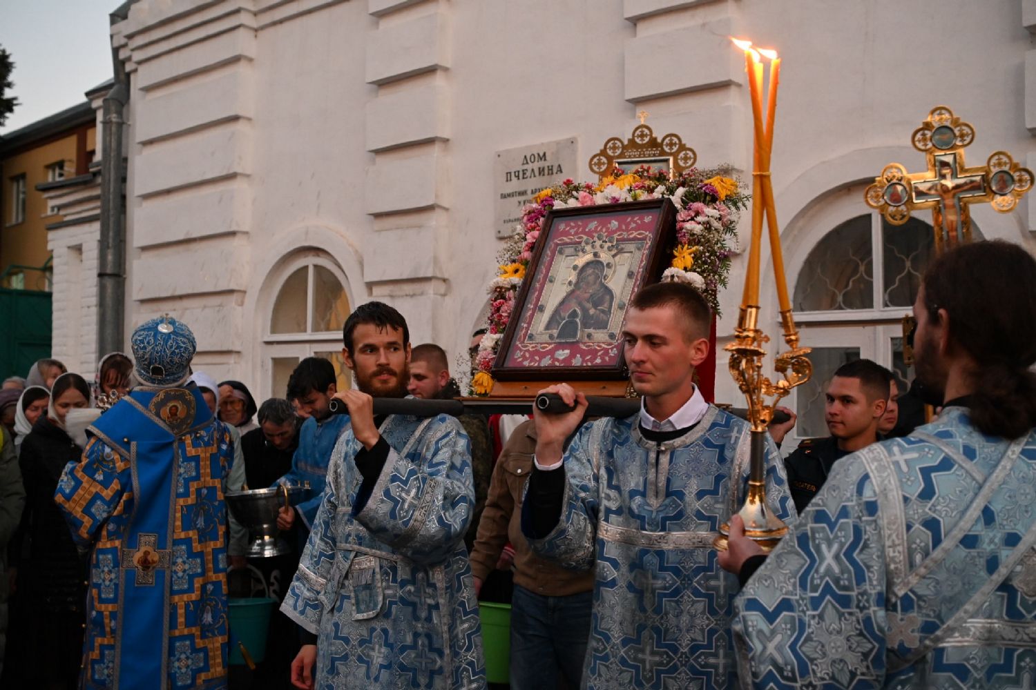 По окончании всенощного бдения крестный ход с Мироносицкой иконой Богородицы продолжился и, обойдя вокруг домового храма, отправился к Вознесенскому собору, где святыню встретили духовенство и прихожане собора.