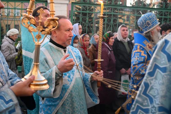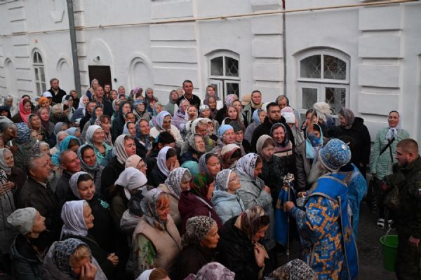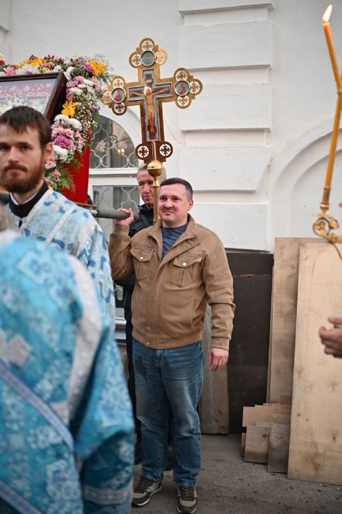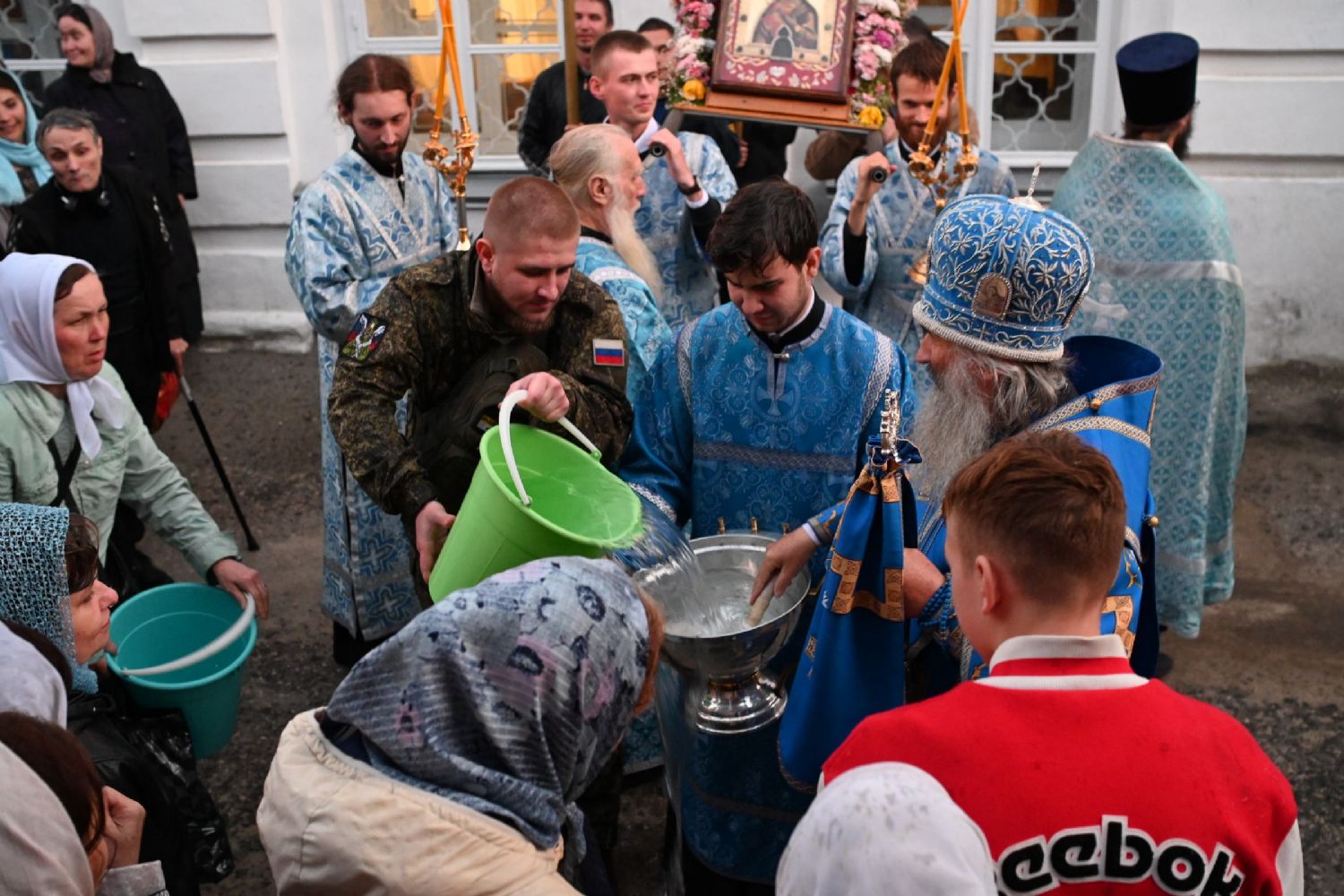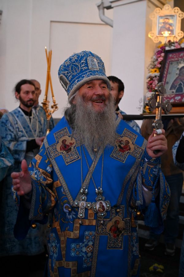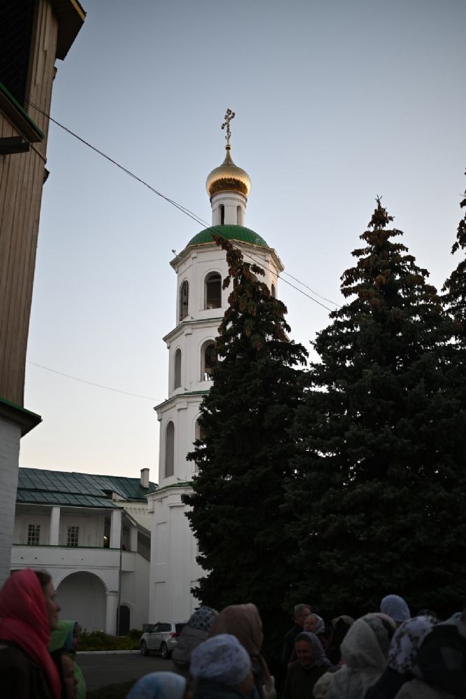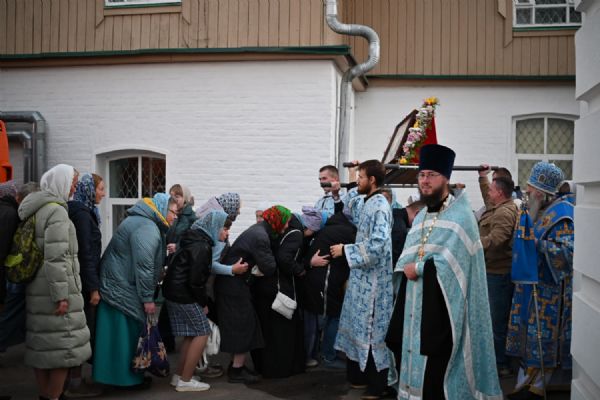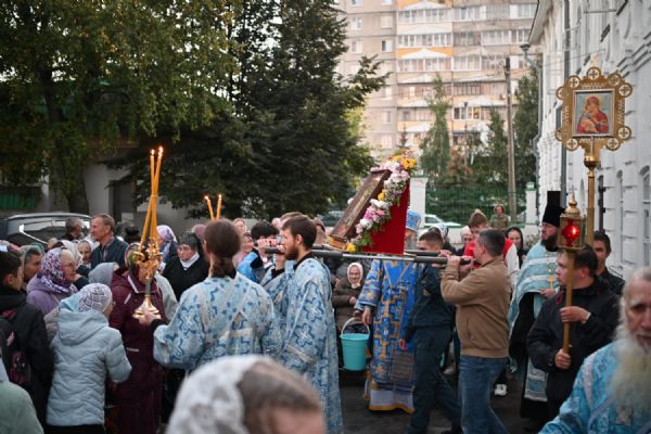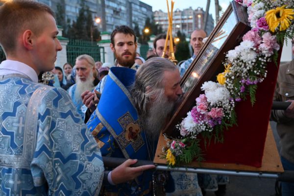 По окончании всенощного бдения крестный ход с Мироносицкой иконой Богородицы продолжился и, обойдя вокруг домового храма, отправился к Вознесенскому собору, где святыню встретили духовенство и прихожане собора.