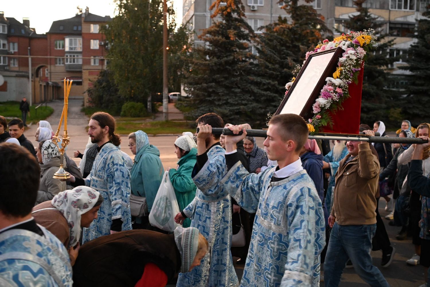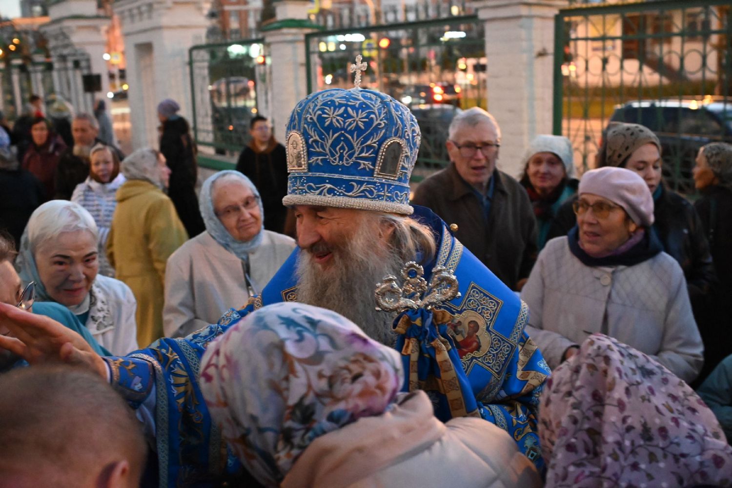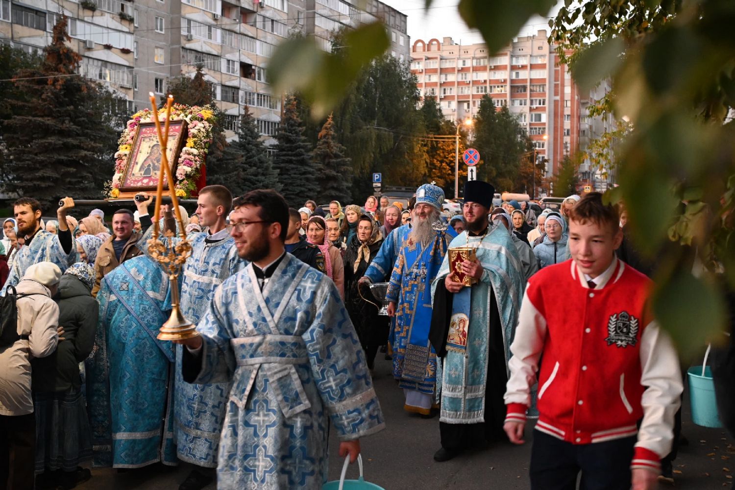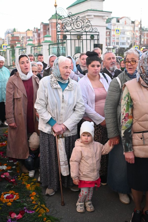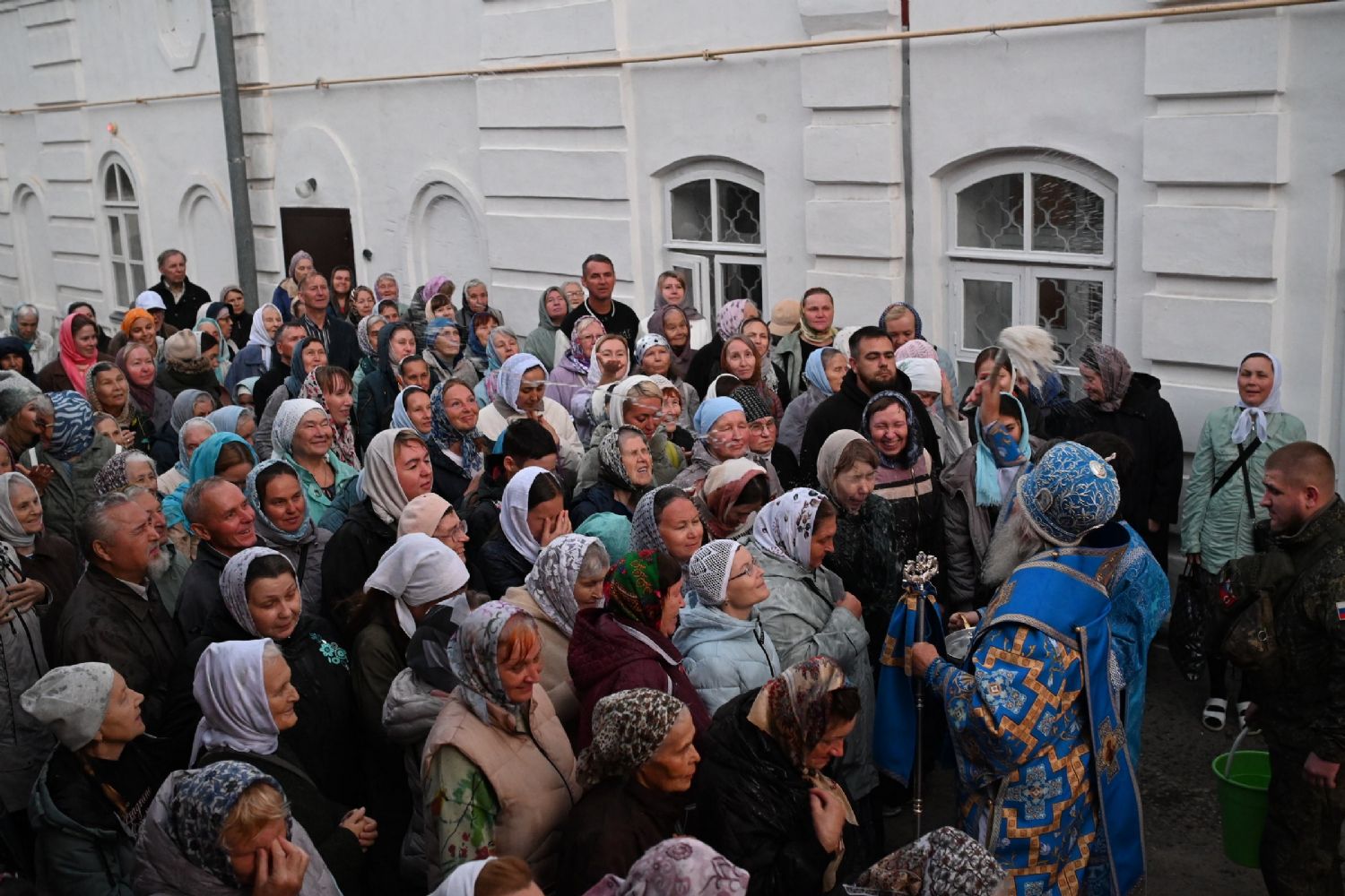 По окончании всенощного бдения крестный ход с Мироносицкой иконой Богородицы продолжился и, обойдя вокруг домового храма, отправился к Вознесенскому собору, где святыню встретили духовенство и прихожане собора.