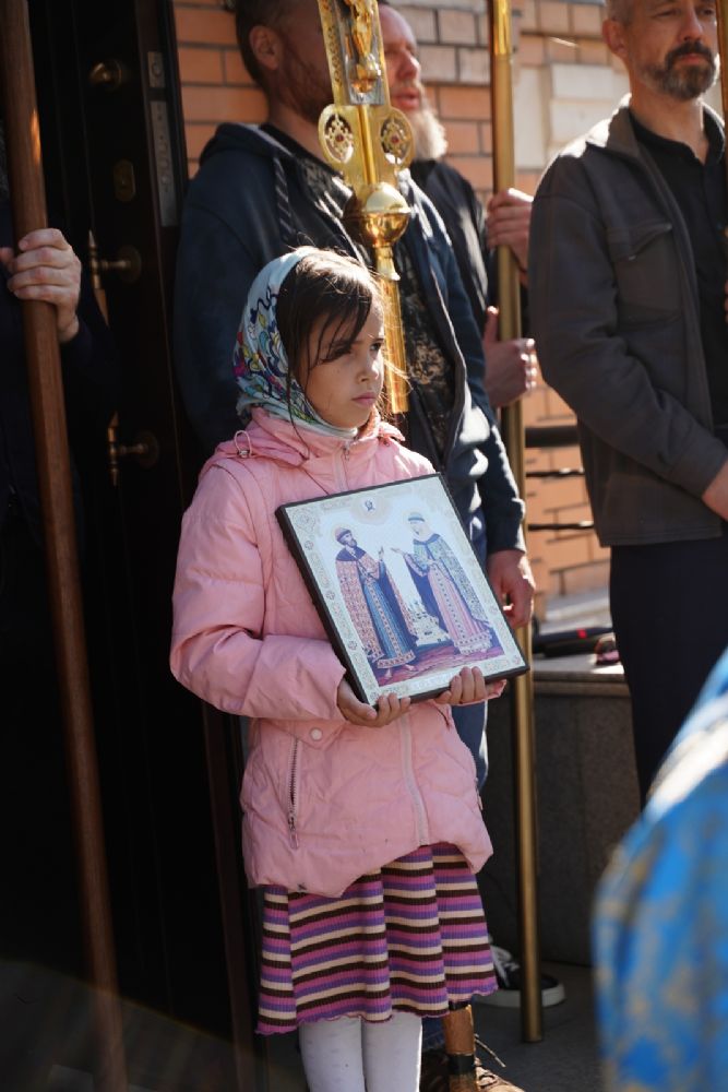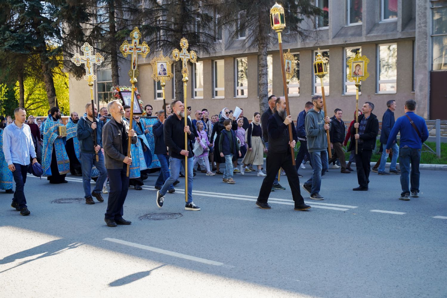 Около строящегося Входоиерусалимского храма, Православного центра и храма мученицы Татианы делались остановки с молитвами Пречистой и кроплением святой водой. У Татианинского храма к крестоходцам присоединились прихожане и клирики храма во главе с настоятелем протоиереем Евгением Сурковым.