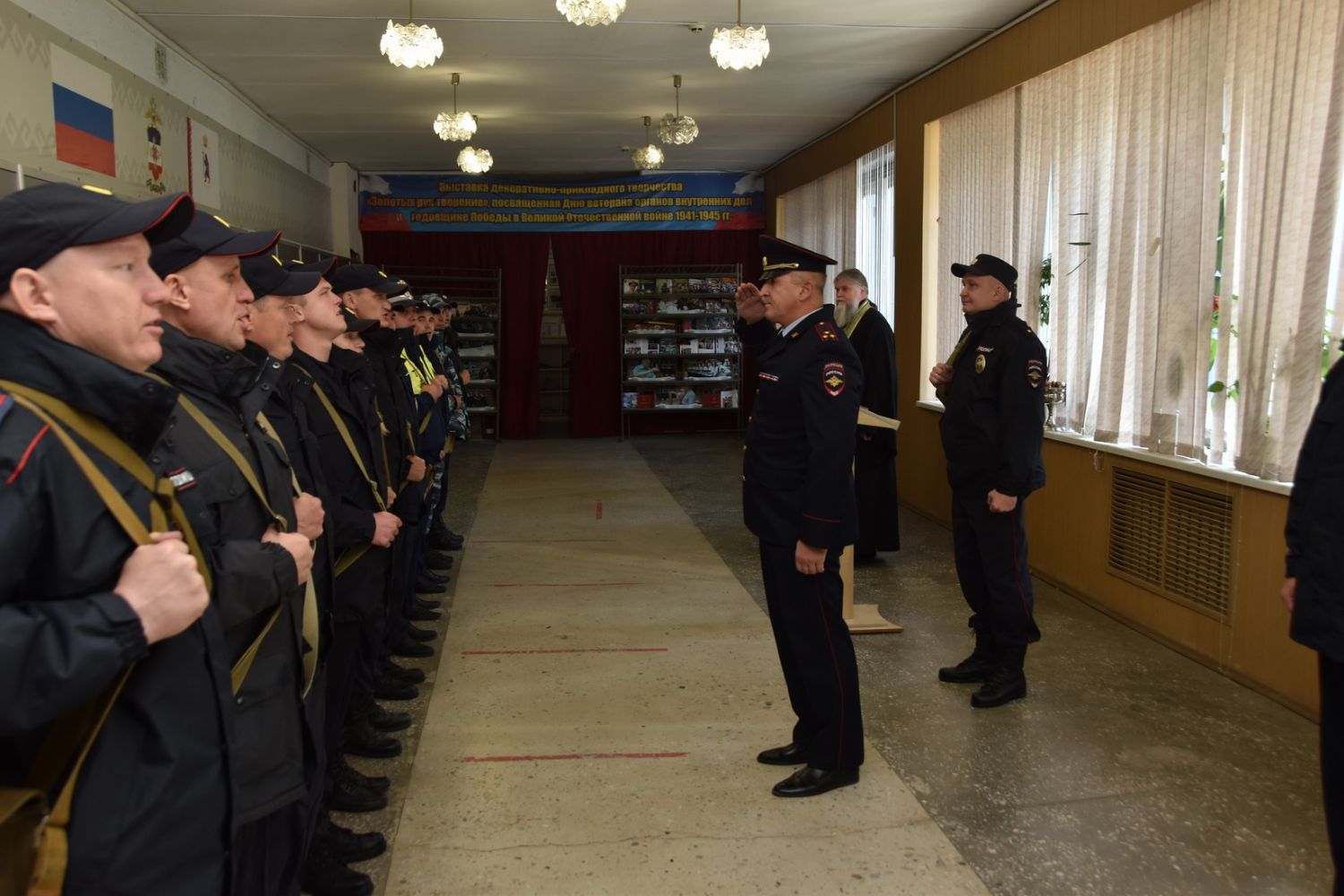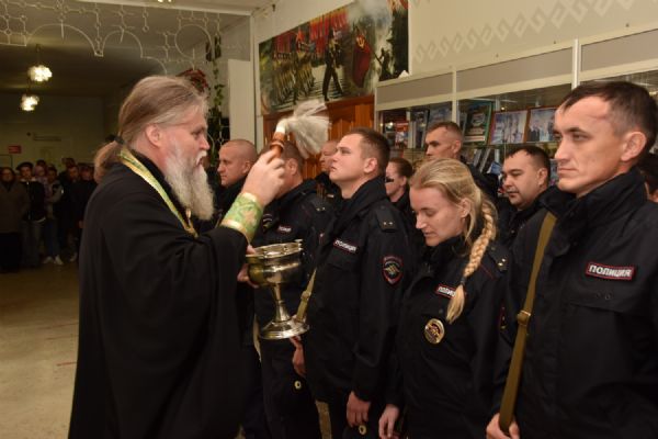 Представитель Общественного совета при МВД, руководитель епархиального отдела по взаимодействию с правоохранительными органами и Вооруженными силами протоиерей Александр Бачурин пожелал полицейским душевного мира, светлых помыслов и мужества при выполнении задач на благо Отечества. После этого священник окропил каждого сотрудника святой водой и вручил им иконы святого великомученика Георгия Победоносца.