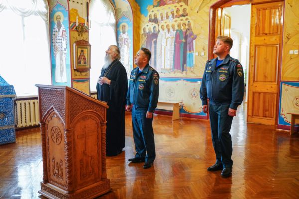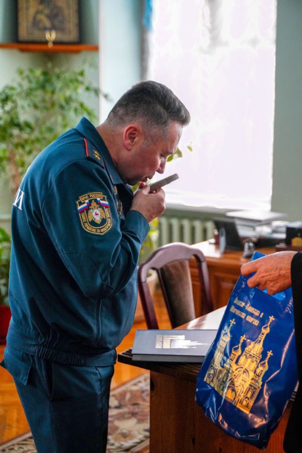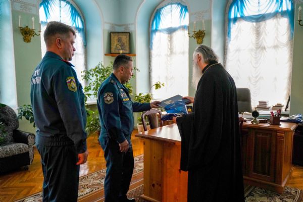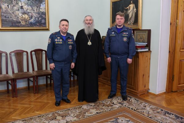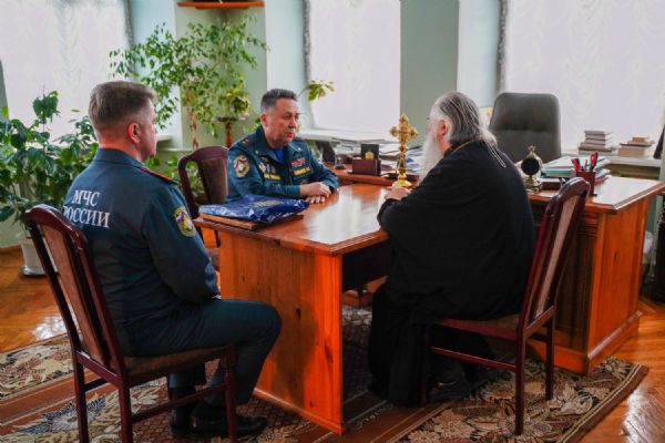 6 октября в Йошкар-Олинском епархиальном управлении состоялась рабочая встреча, в которой приняли участие митрополит Йошкар-Олинский и Марийский Иоанн, начальник Главного управления МЧС России по Нижегородской области, председатель Совета руководителей главных управлений МЧС России в ПФО генерал-лейтенант внутренней службы Валерий Синьков и начальник Главного управления МЧС России по Республике Марий Эл генерал-майор внутренней службы Виктор Шангин.