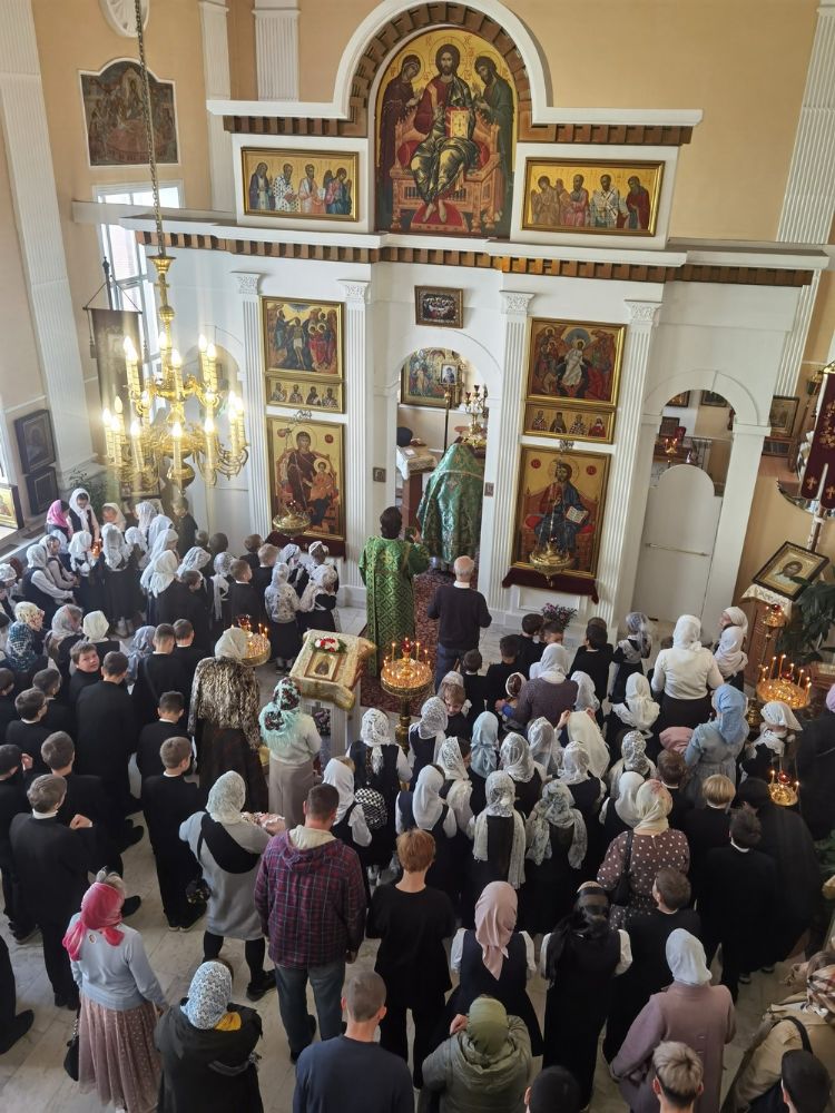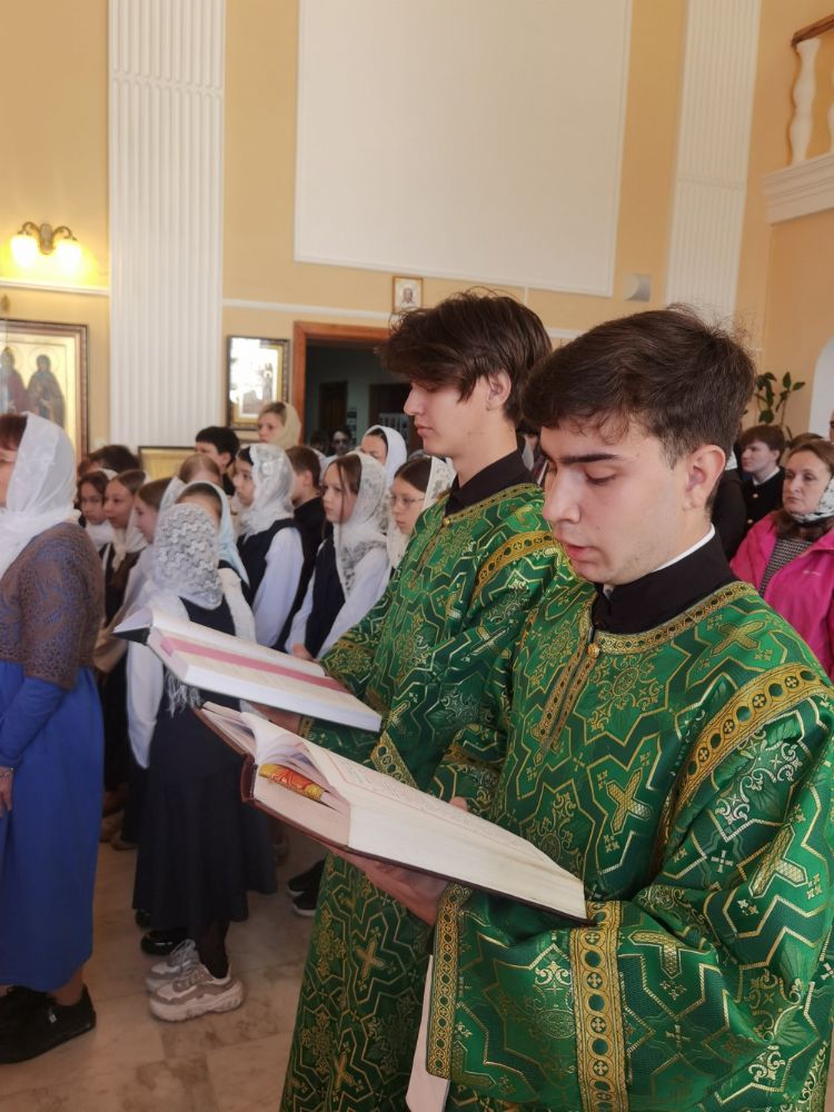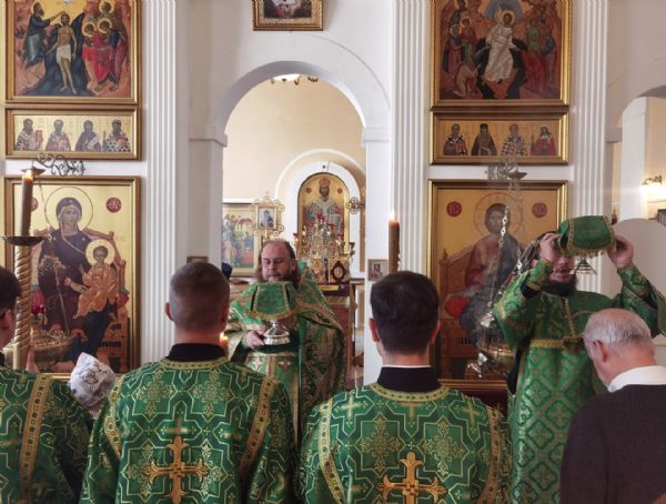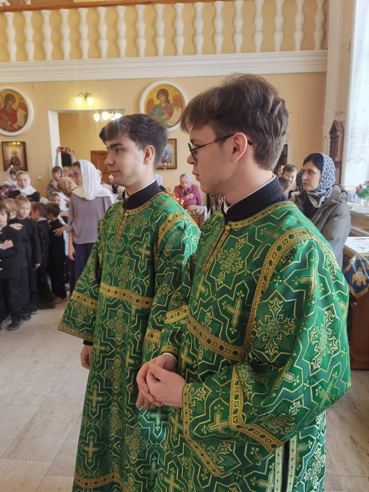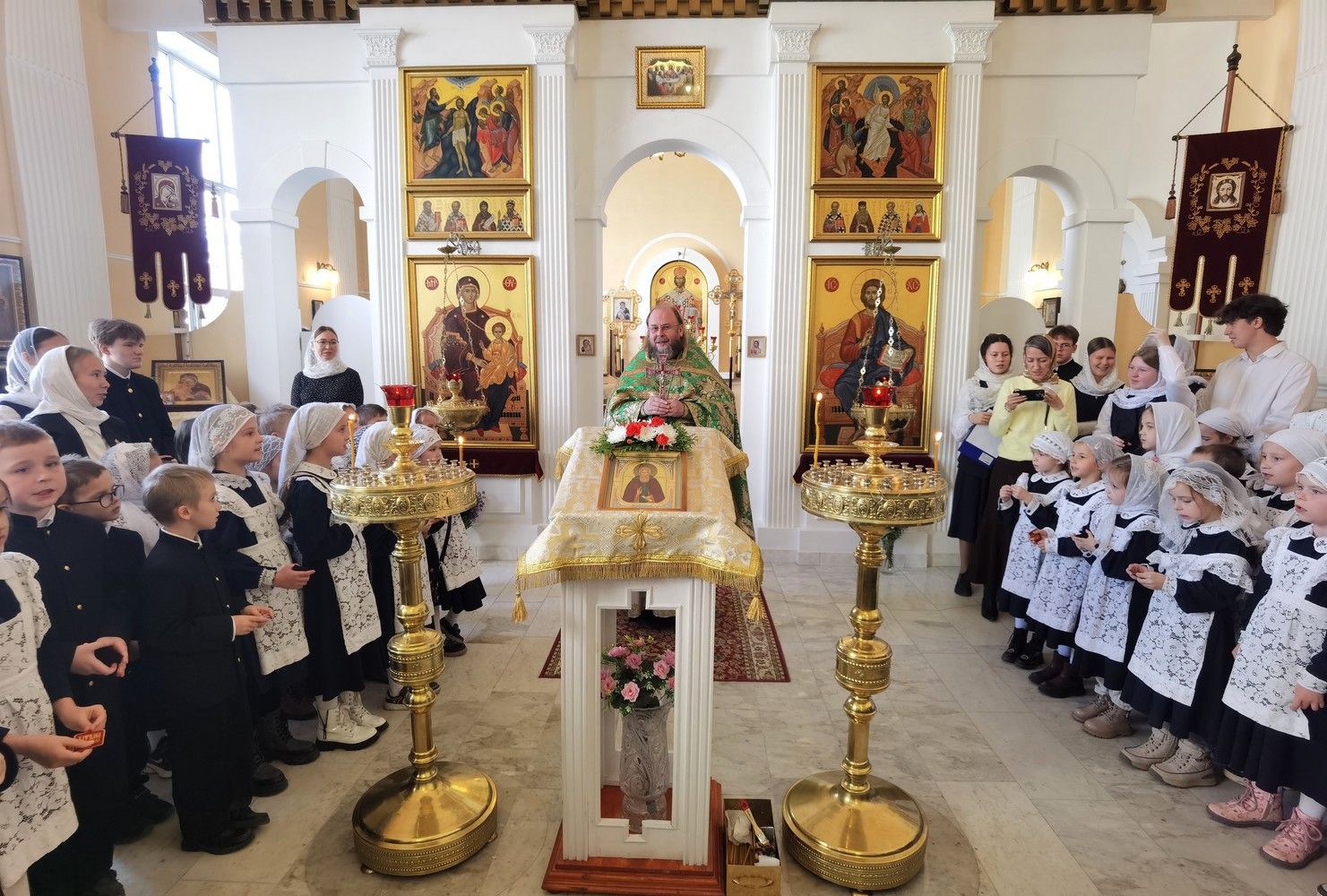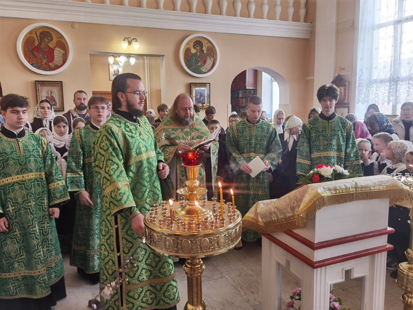 Праздничную Божественную литургию совершил настоятель храма, директор гимназии протоиерей Евгений Сурков в сослужении диакона Никиты Суркова – бывшего выпускника, а ныне преподавателя гимназии. Песнопения исполнял хор храма под управлением регента Аллы Симаковой. Исповедь принимали иерей Евгений Симаков и иерей Димитрий Копылов.