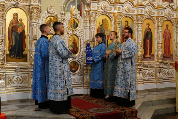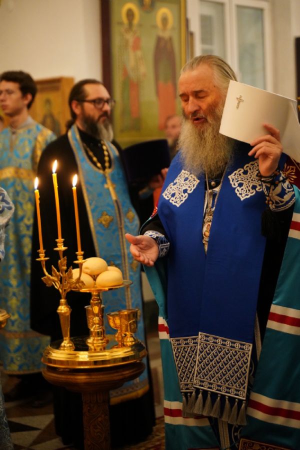За богослужением читались ветхозаветные паримии из книг Бытия, Пророка Иезекииля и Притчей Соломоновых, прообразующие Пресвятую Богородицу. На литии освящались хлебы, пшеница, вино и елей.