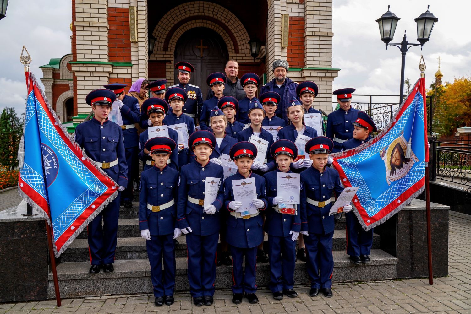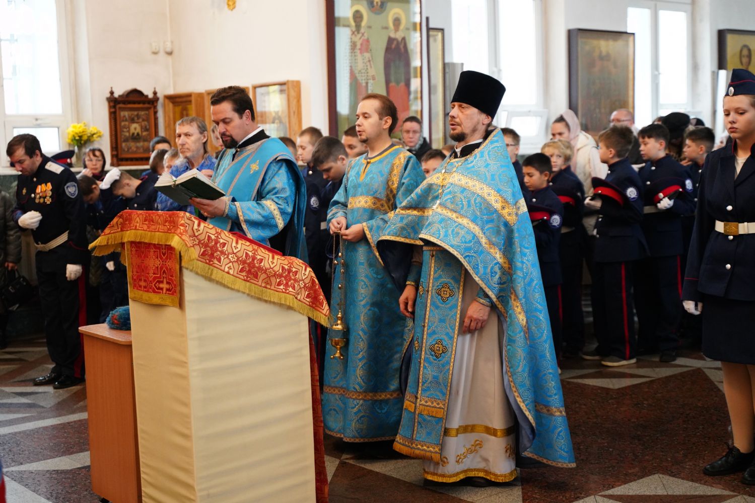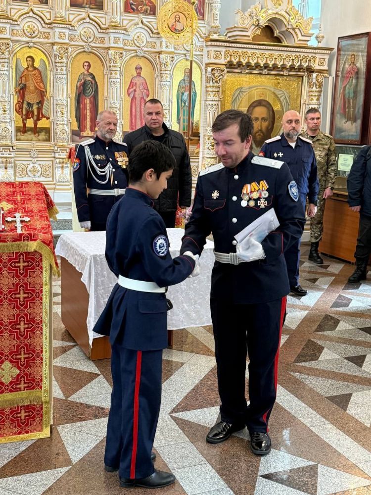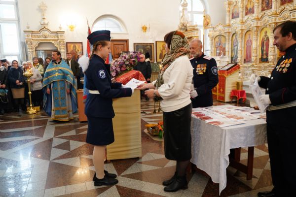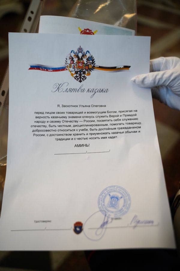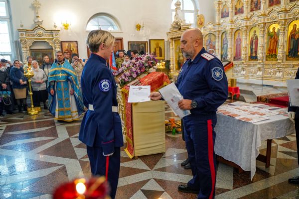 По возвращении в собор состоялась торжественная церемония приведения к присяге юных казаков-кадетов. К этому знаменательному дню ребята готовились заранее — не просто выучили слова присяги, но и изучили историю России и казачества, начали осваивать основы строевой и огневой подготовки. Возложив руку на лежащее на аналое святое Евангелие, кадеты клялись верно служить Отечеству, хранить православную веру и традиции славных предков. Настоятель собора, духовник хутора «Царевококашйский» иерей Андрей Кочаков окропил ребят святой водой и пожелал быть достойными сынами и дочерьми Святой Руси.