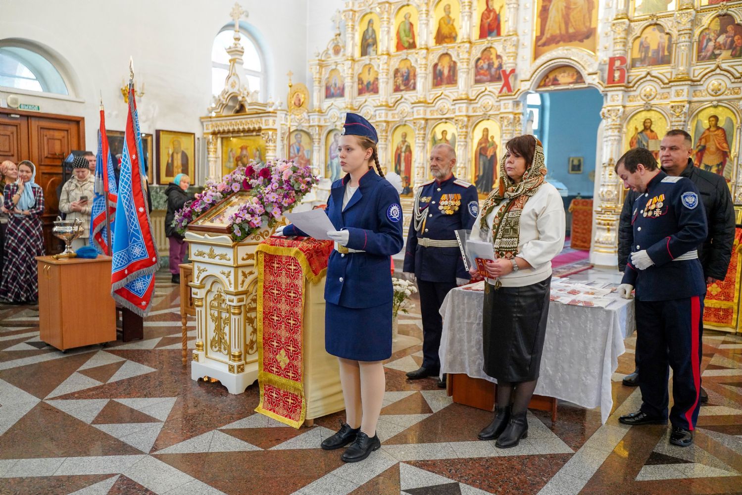 За богослужением молились учащихся кадетского класса школы 32 г. Йошкар-Олы, их родители, казаки хутора «Царевококшайский», представители руководства Республики Марий Эл и города Йошкар-Олы.