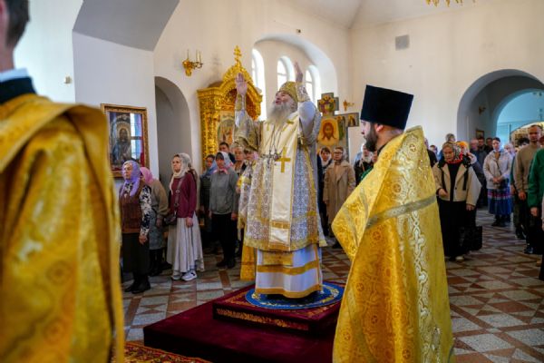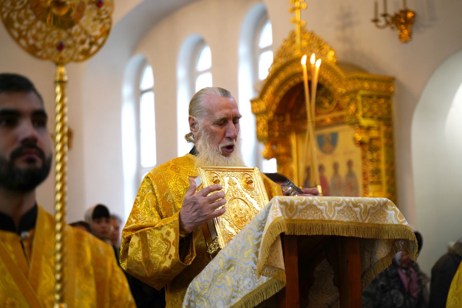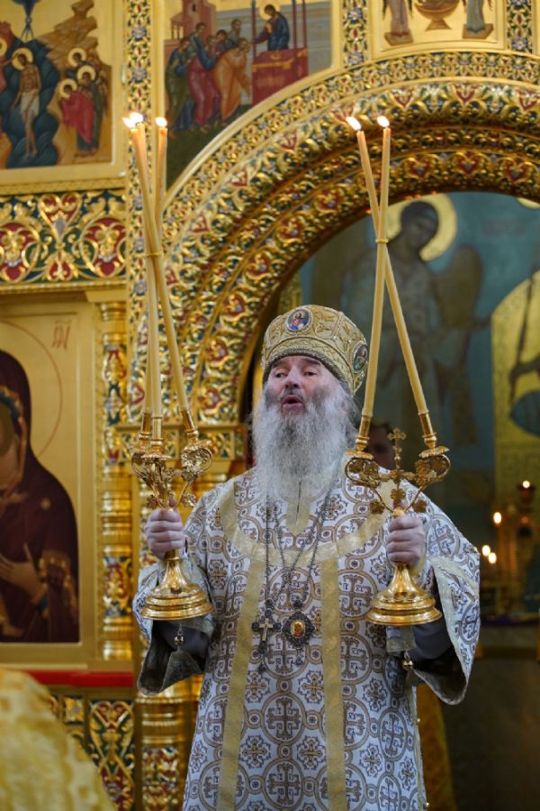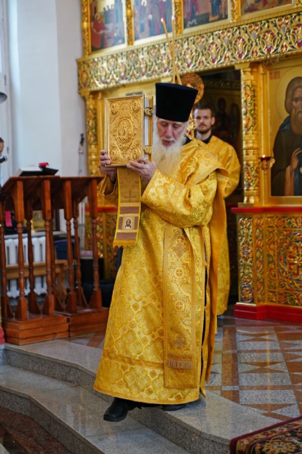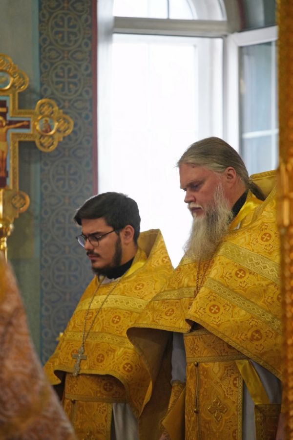 Его Высокопреосвященству сослужили настоятель храма протоиерей Александр Бачурин, клирики храма иерей Виктор Умрихин и диакон Алексий Ершов, а также протодиакон Михаил Козловский и клирик Минусинской епархии иерей Матфей Фокша. Песнопения исполняли хор храма под управлением регента Елены Умрихиной и детский хор воскресной школы под руководством Анны Михеевой.