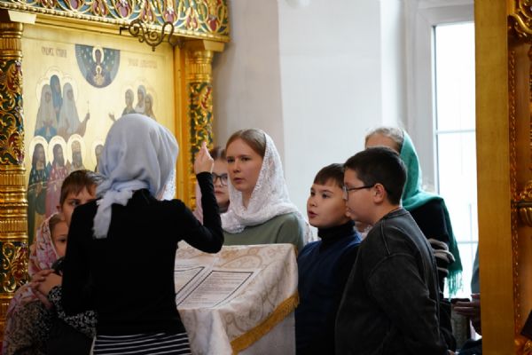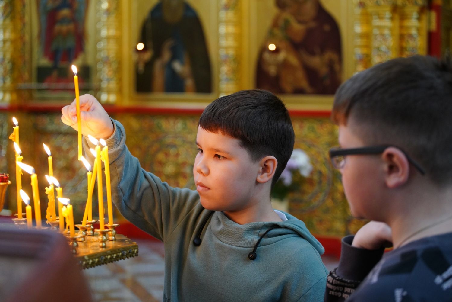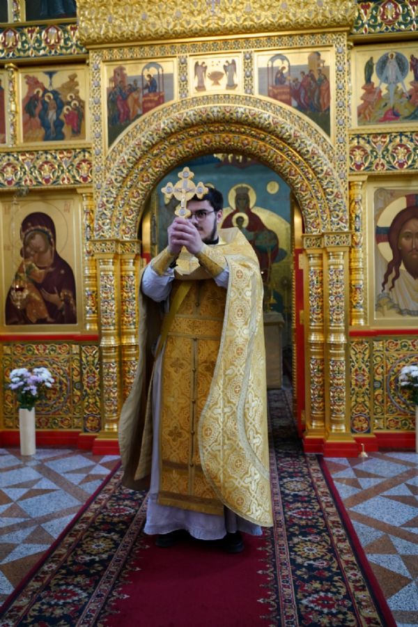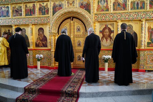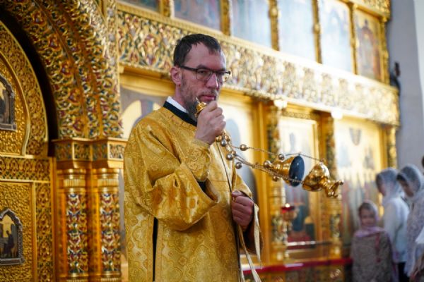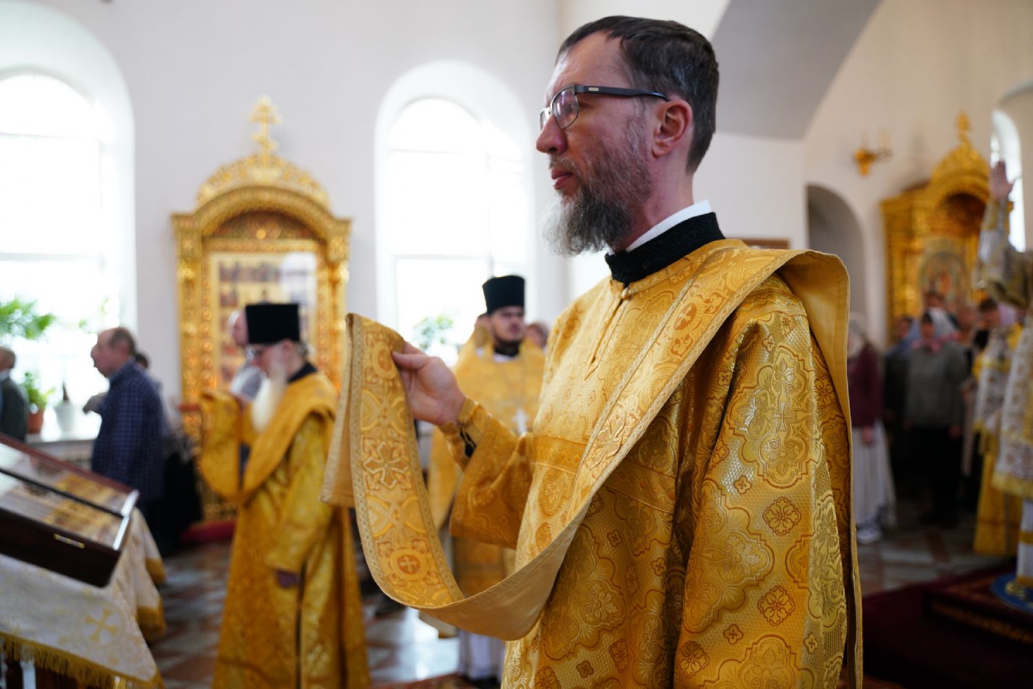 Его Высокопреосвященству сослужили настоятель храма протоиерей Александр Бачурин, клирики храма иерей Виктор Умрихин и диакон Алексий Ершов, а также протодиакон Михаил Козловский и клирик Минусинской епархии иерей Матфей Фокша. Песнопения исполняли хор храма под управлением регента Елены Умрихиной и детский хор воскресной школы под руководством Анны Михеевой.
