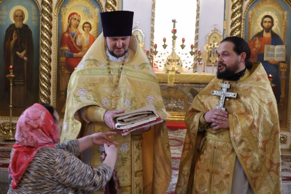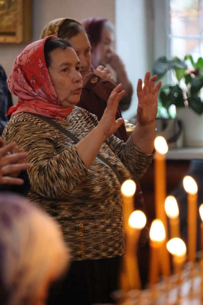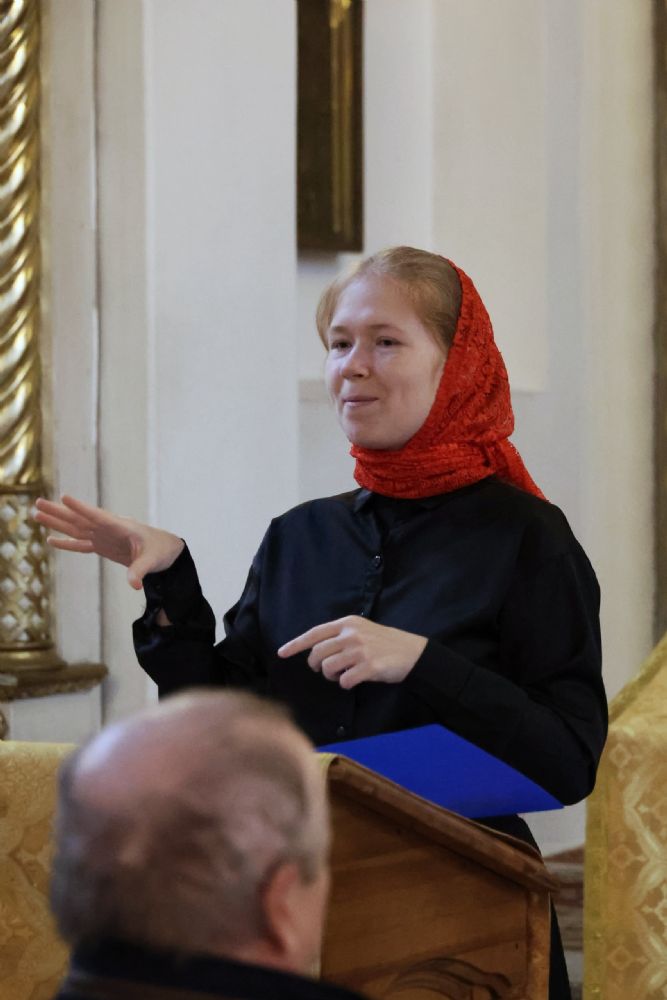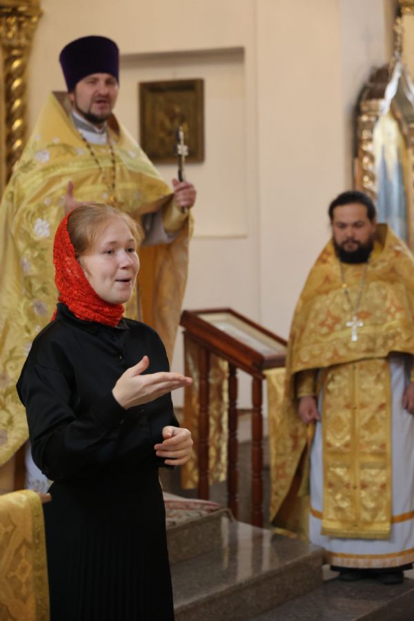 Молитвословия богослужения на языке жестов переводила сурдопереводчик Благовещенского собора г. Йошкар-Олы Мария Долгова. Некоторые возгласы духовник общины глухих иерей Никифор Захаров сам показывал на жестовом языке.