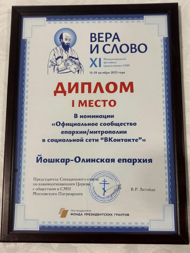 Группа ВКонтакте «Православие в Марий Эл» Йошкар-Олинской епархии отмечена Дипломом I степени XI Международного фестиваля «Вера и слово».
