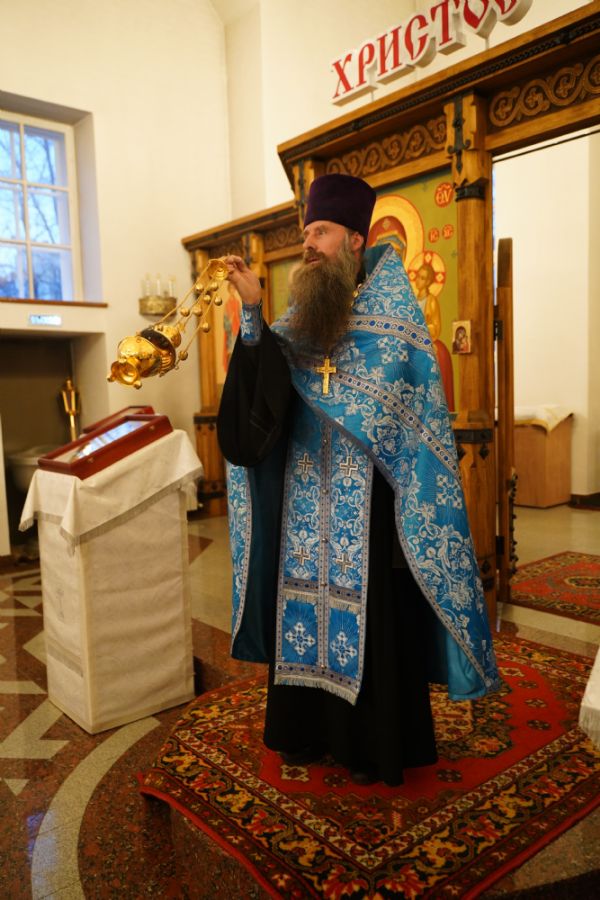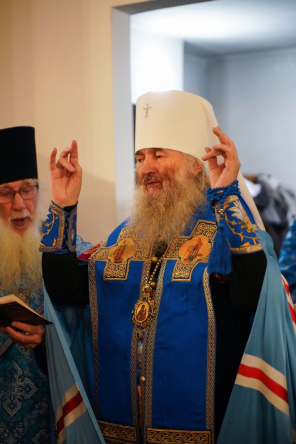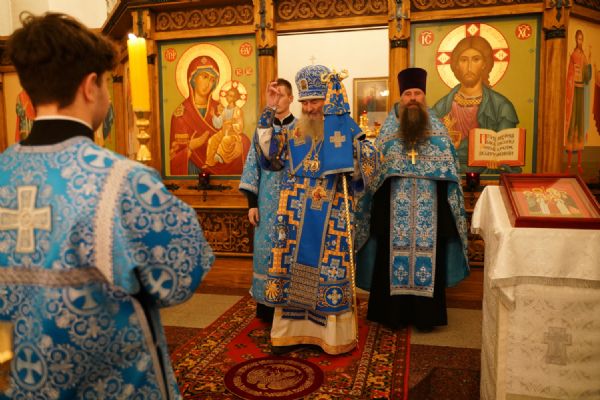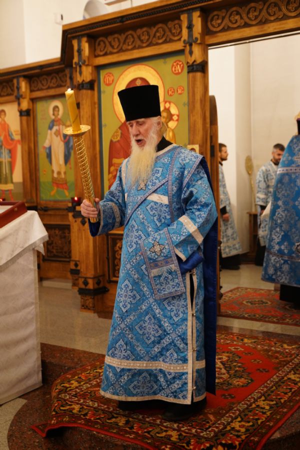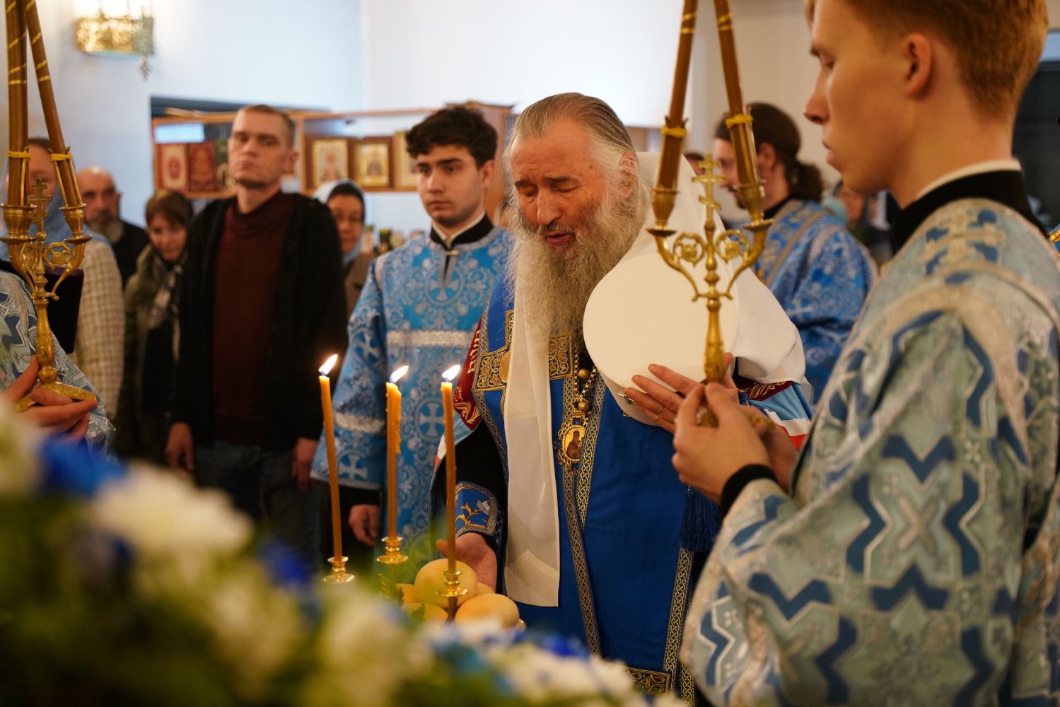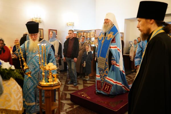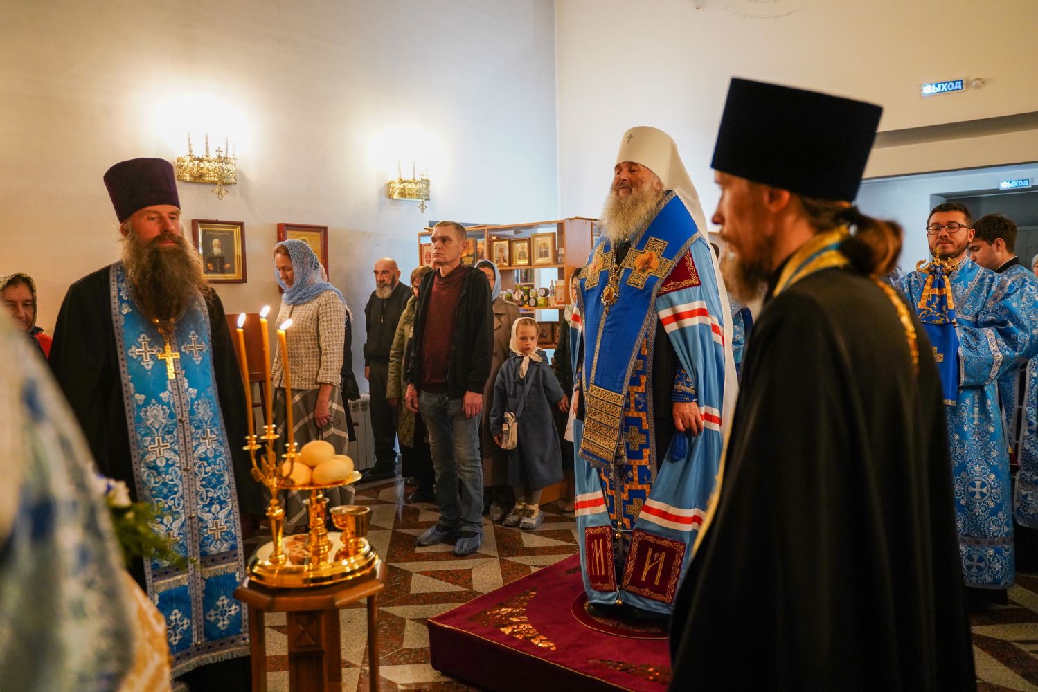 Его Высокопреосвященству сослужили настоятель храма иерей Михаил Горицкий, клирик храма иерей Евгений Хованский и протодиакон Михаил Козловский. Песнопения исполнял малы состав хора "Благовест" под управлением регента Ирины Айгловой.
