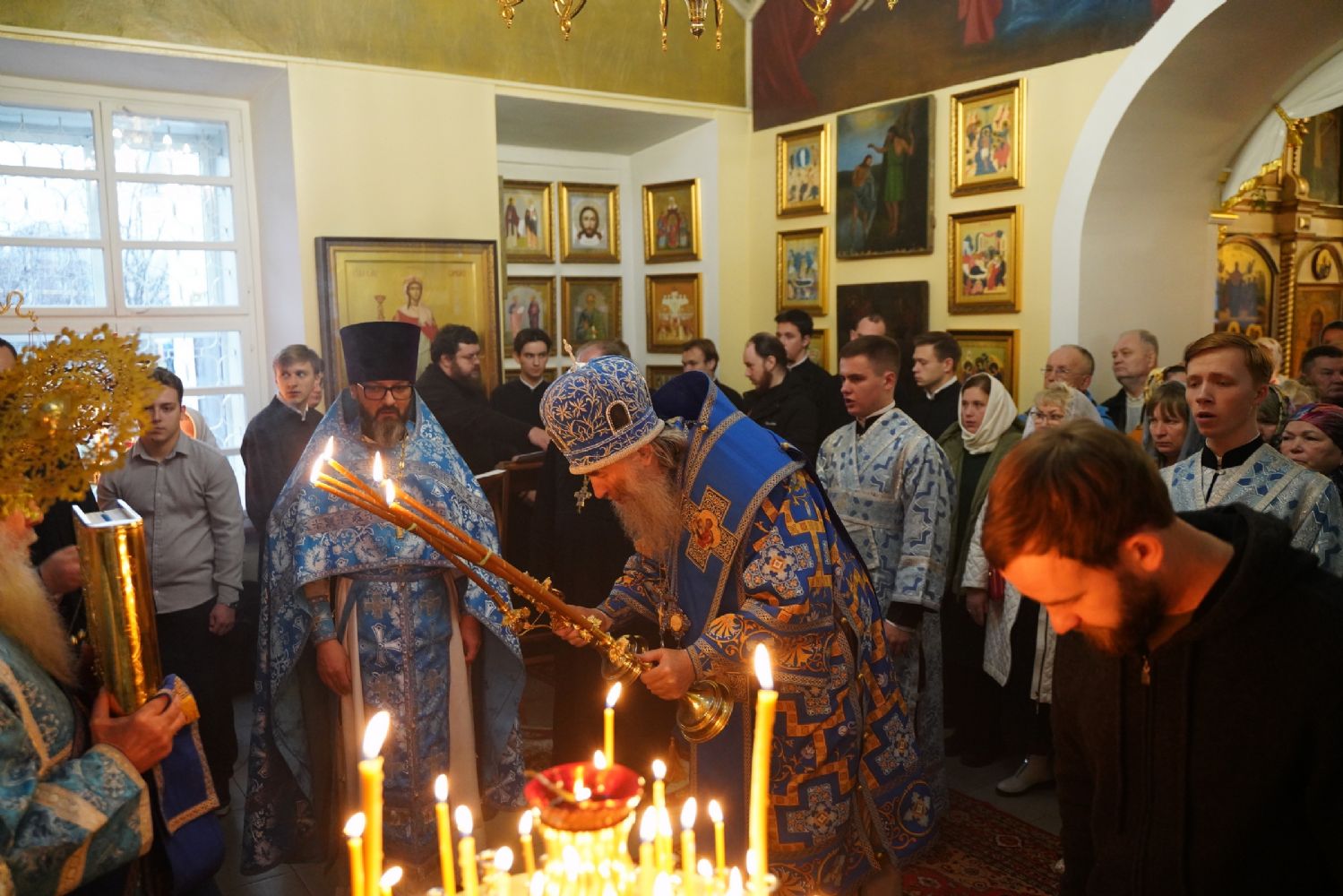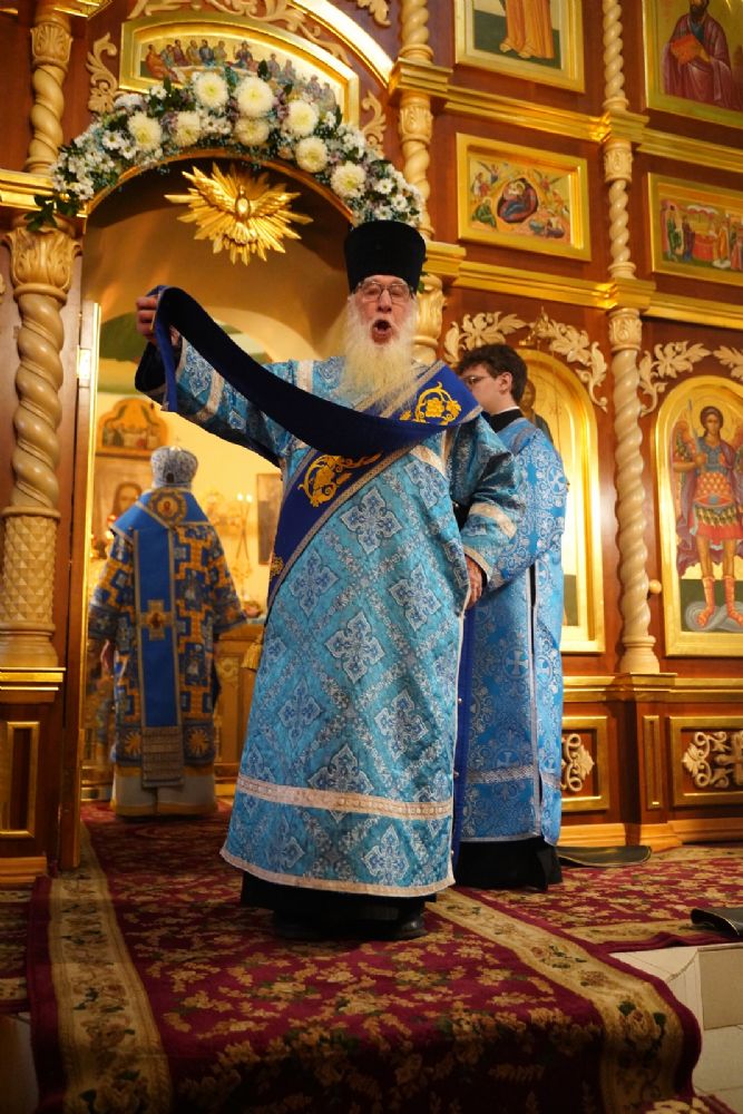 Архипастырю сослужили секретарь Йошкар-Олинского епархиального управления иерей Димитрий Дьяков, настоятель храма иерей Александр Коваль, ключарь Благовещенского кафедрального собора г. Йошкар-Олы протоиерей Сергий Поглазов, клирик Благовещенского собора диакон Андрей Дружинин и протодиакон Михаил Козловский. Песнопения исполнял хор Троице-Сергиевой лавры под управлением иеромонаха Нестора (Волкова).
