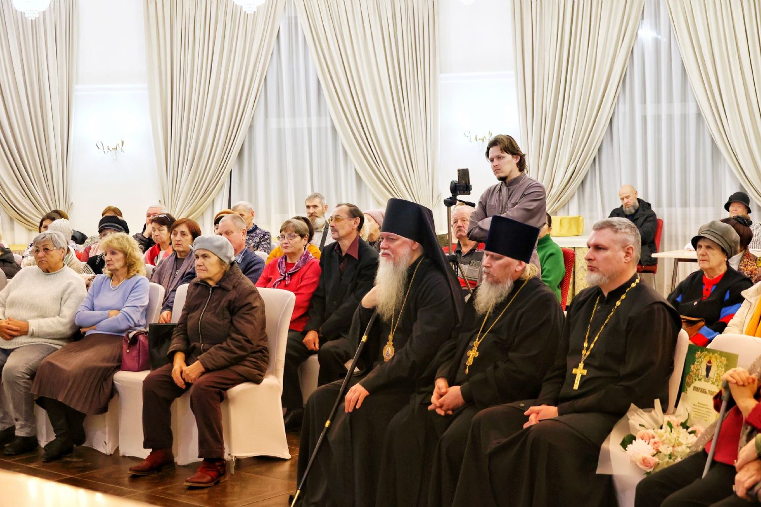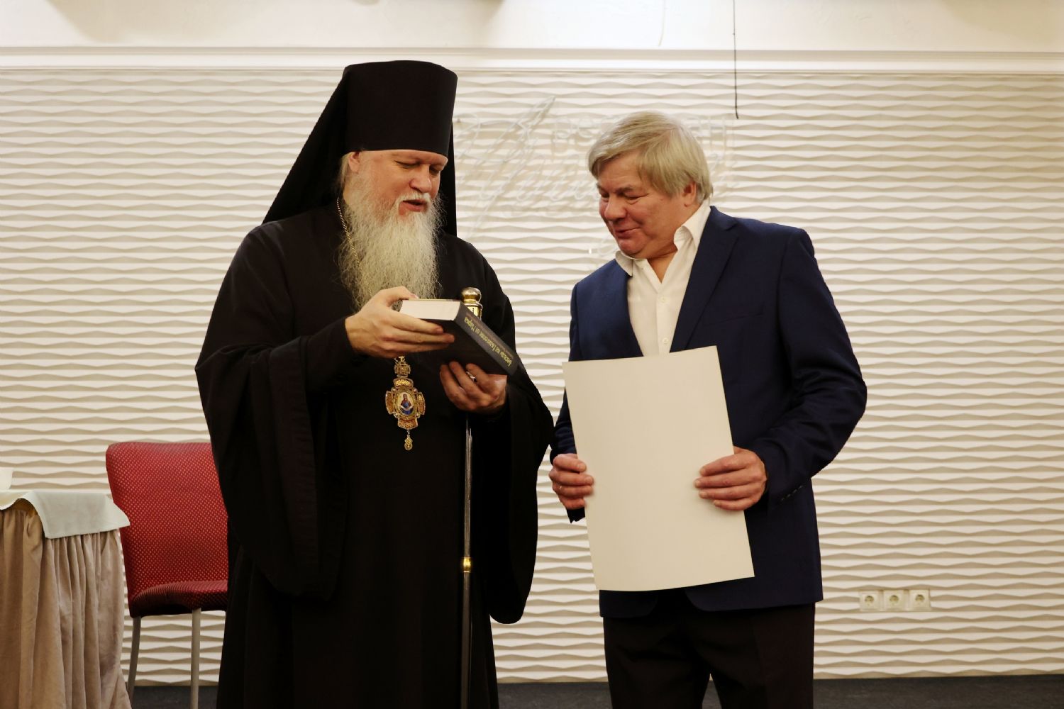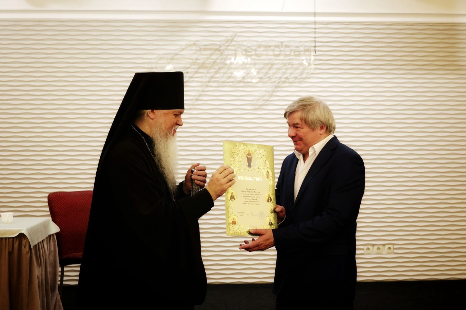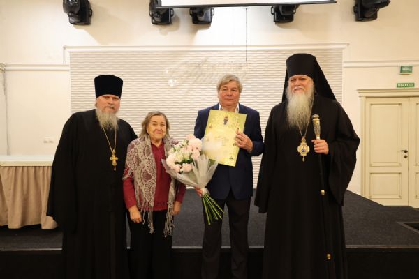 В завершение епископ Феофан тепло поблагодарил Виктора Андреевича за прекрасное исполнение есенинских стихов и вручил народному артисту Виктору Никитину архиерейскую грамоту за многолетние труды в образовании и духовном просвещении жителей Республики Марий Эл на благо Волжской епархии.