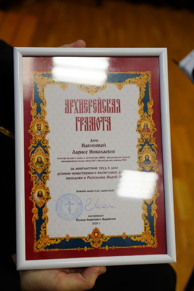 Далее в рамках пленарного заседания Чтений митрополит Иоанн вручил ряд наград: медалью священномученика Леонида, епископа Марийского, III степени награждены клирик Вознесенского собора г. Йошкар-Олы протоиерей Георгий Втюрин и декан факультета гуманитарного образования Поволжского государственного технологического университета Артамонова Анна Владимировна. Архиерейских грамот удостоены учитель русского языка и литературы Медведевской школы № 2 Накипова Лариса Николаевна, педагог Дворца творчества детей и молодежи Мальцева Вита Викторовна, социальный педагог школы-интерната «Дарование» г. Козьмодемьянска Сарынин Владлен Витальевич и проректор Межрегионального открытого социального института Баланчук Ольга Евгеньевна.