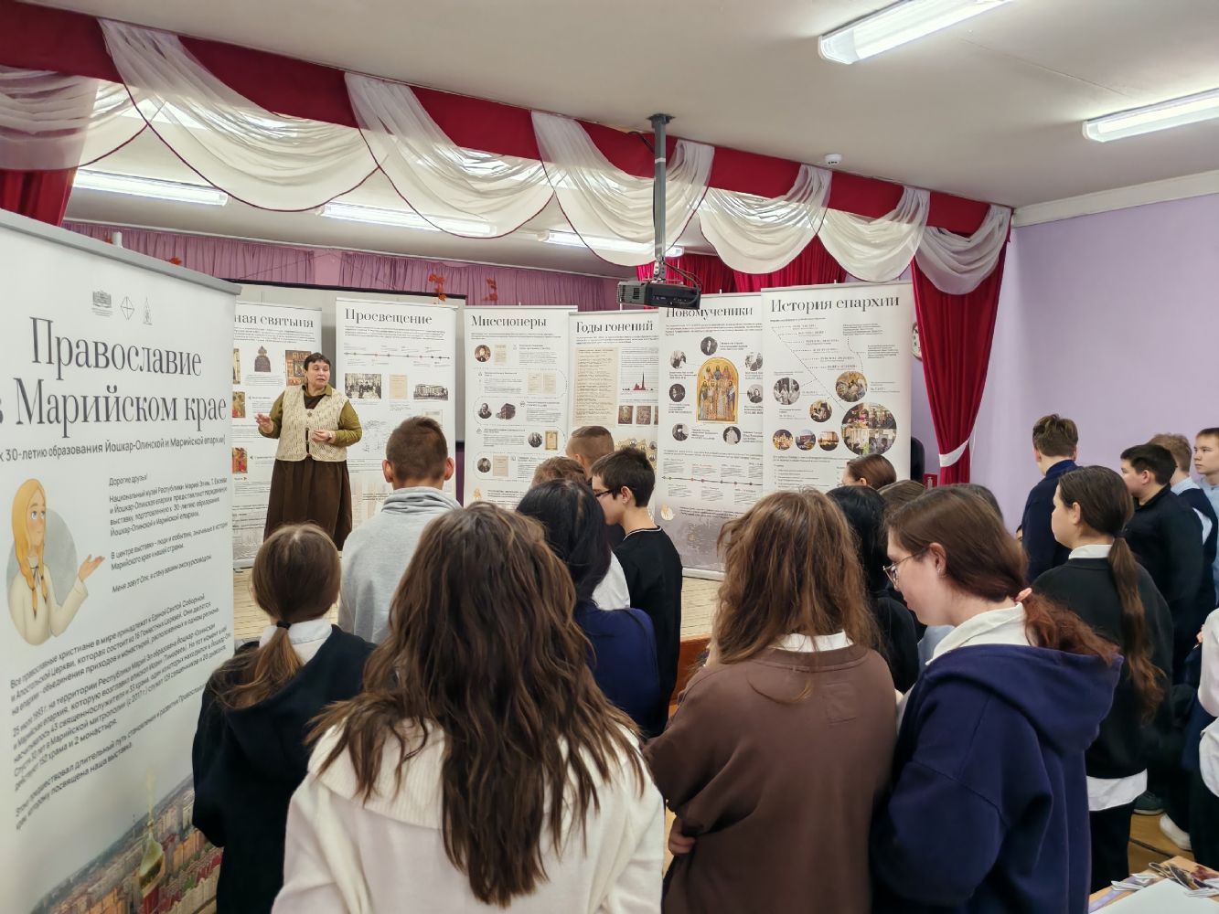 Гости приехали с насыщенной православной программой и передвижной выставкой, созданной к 30-летию образования Йошкар-Олинской епархии и состоящей из 10 информационных баннеров. В школе их радушно встретили учащиеся и педагоги, а также настоятель Богоявленского храма с. Великополье иерей Олег Михайлов с матушкой Татианой.