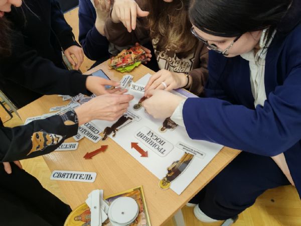 Школьники живо отозвались на предложение, их поддержали учителя и матушка с батюшкой. Все вместе поделились на пять команд: «Храм Богоявления Господня», «Монастыри», «Звезды, «Черепашки», «Вдохновение». Ребята выполняли задания с энтузиазмом и большим вниманием, вновь и вновь рассматривали информацию выставки, очень старались, чтобы ответы получались максимально точными. Командам нужно было собрать карту Марийской митрополии, разделенной на две епархии, расположить в правильном порядке клейма вокруг Мироносицкой иконы Пресвятой Богородицы, выбрать правильные определения таких терминов, как «святитель», «список», «хиротония», «солея», правильно расположить имена святых вокруг иконы новомучеников Марийских, разложить названия монастырей на женские и мужские… Очень захватывающей и интересной оказалось задание «стрела времени», где ребята должны были разложить хронологические события по годам.