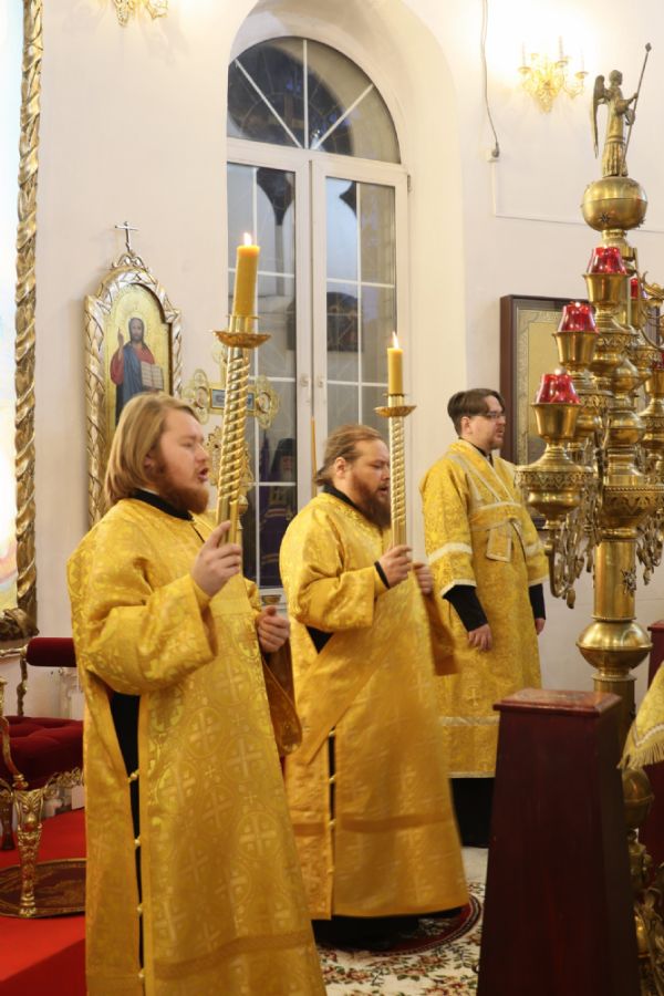 За Литургией архипастырю сослужили клирики кафедрального собора иерей Николай Аникин, иеромонах Александр (Чеборов), иерей Сергий Першаков, иеромонах Питирим (Мосякин), диакон Иоанн Захаров и диакон Александр Викторов. Песнопения исполняли два хора – архиерейский (регент Любовь Михеева) и народный под управлением Евгения Чигарова.