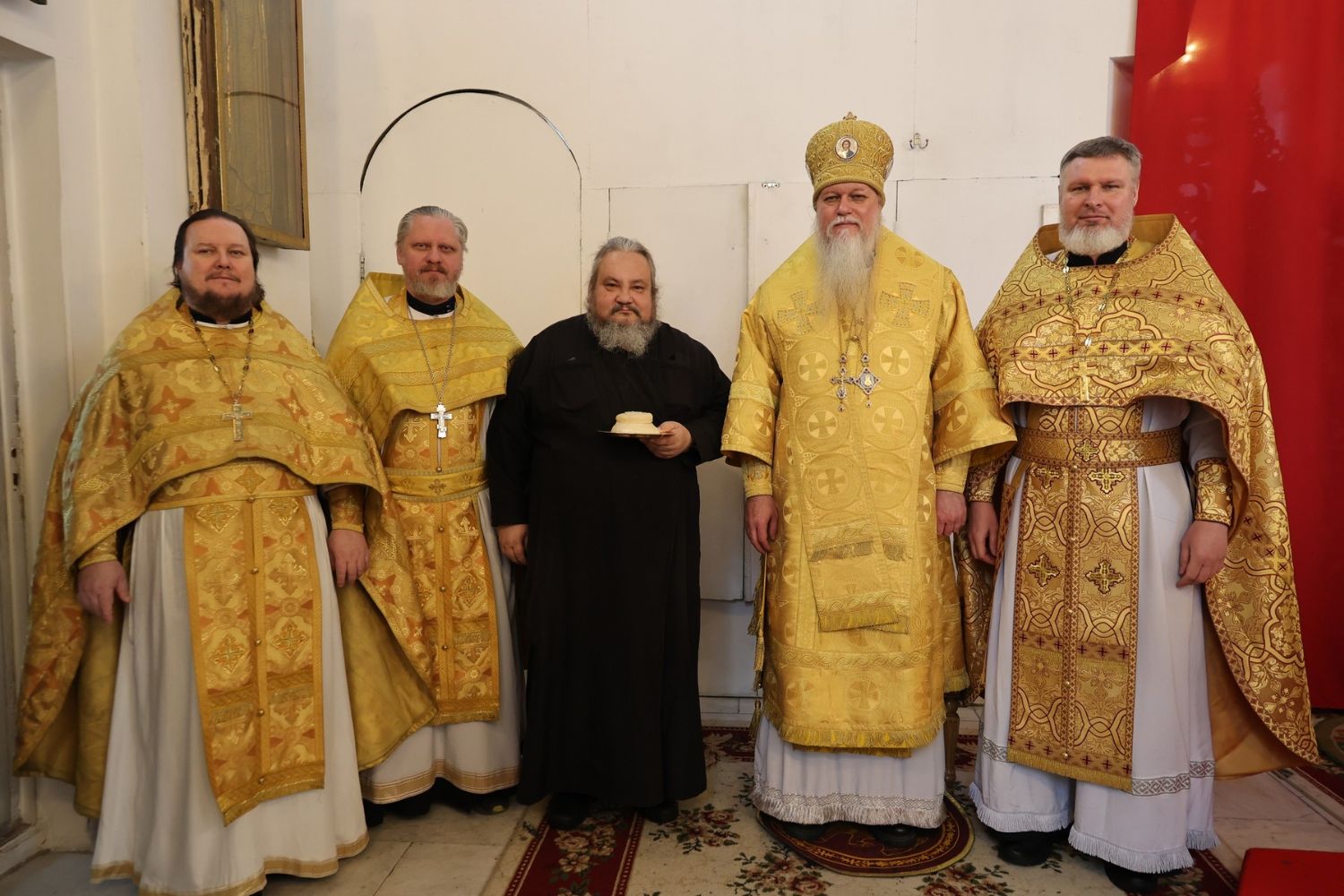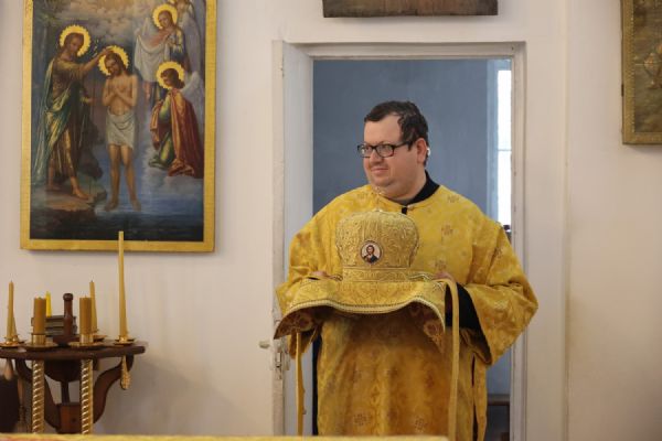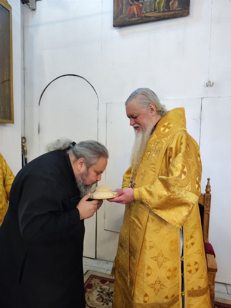 После Причащения священнослужителей Святых Христовых Таин в алтаре владыка Феофан поздравил иеродиакона Спиридона (Холмовского) с днем небесного покровителя.