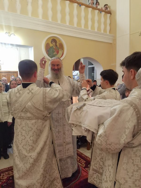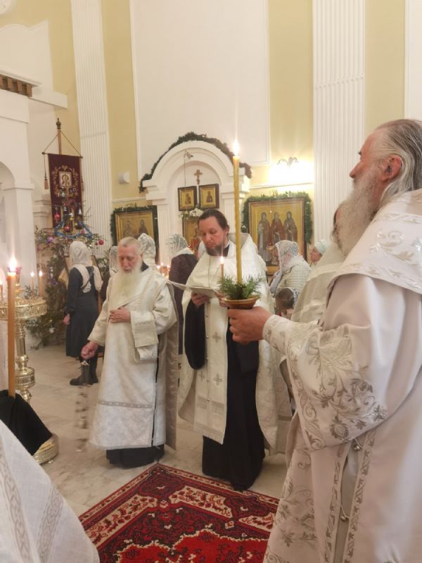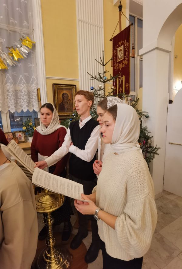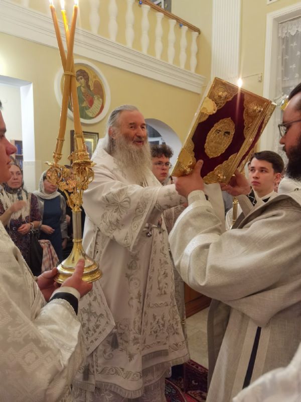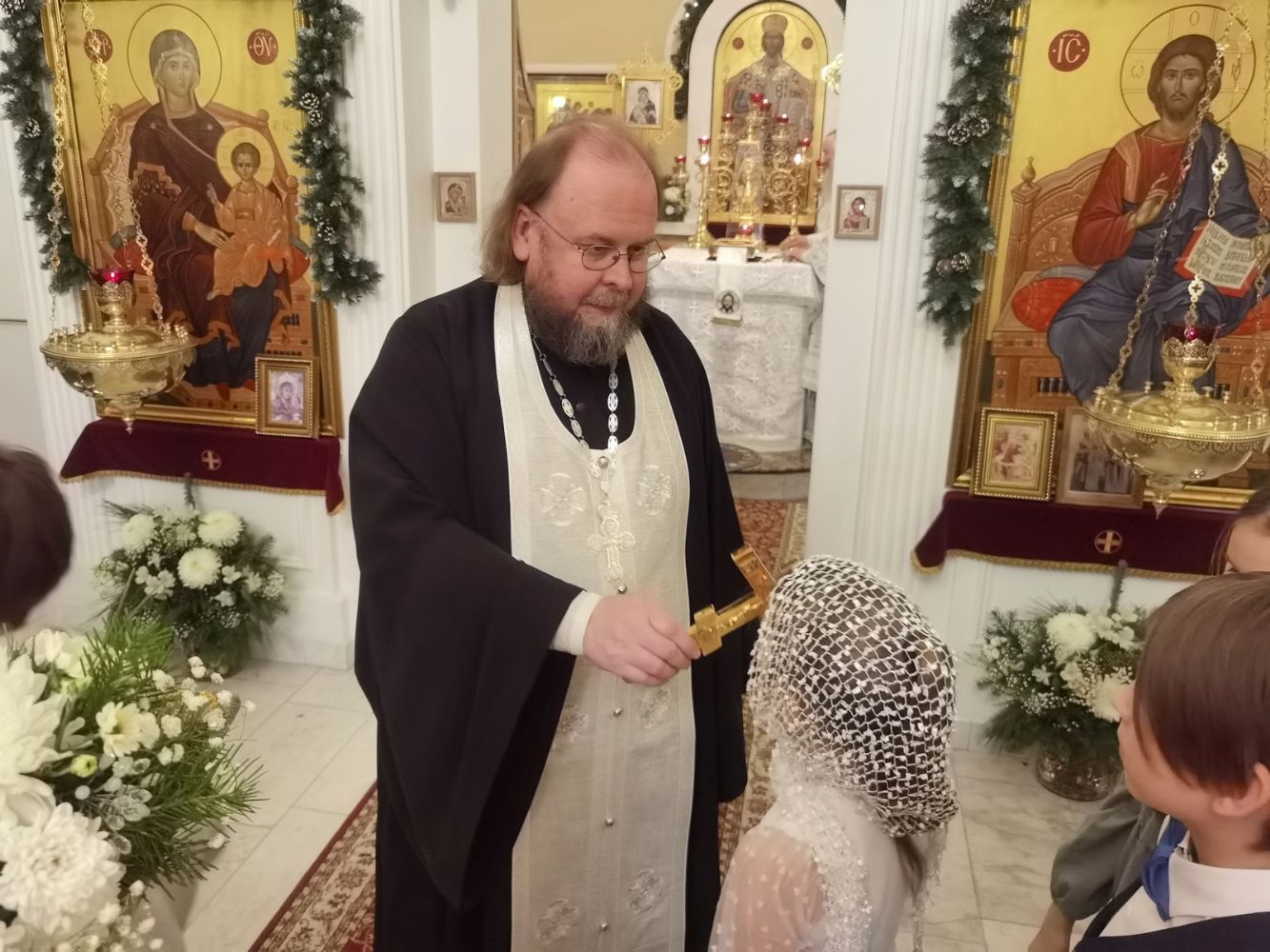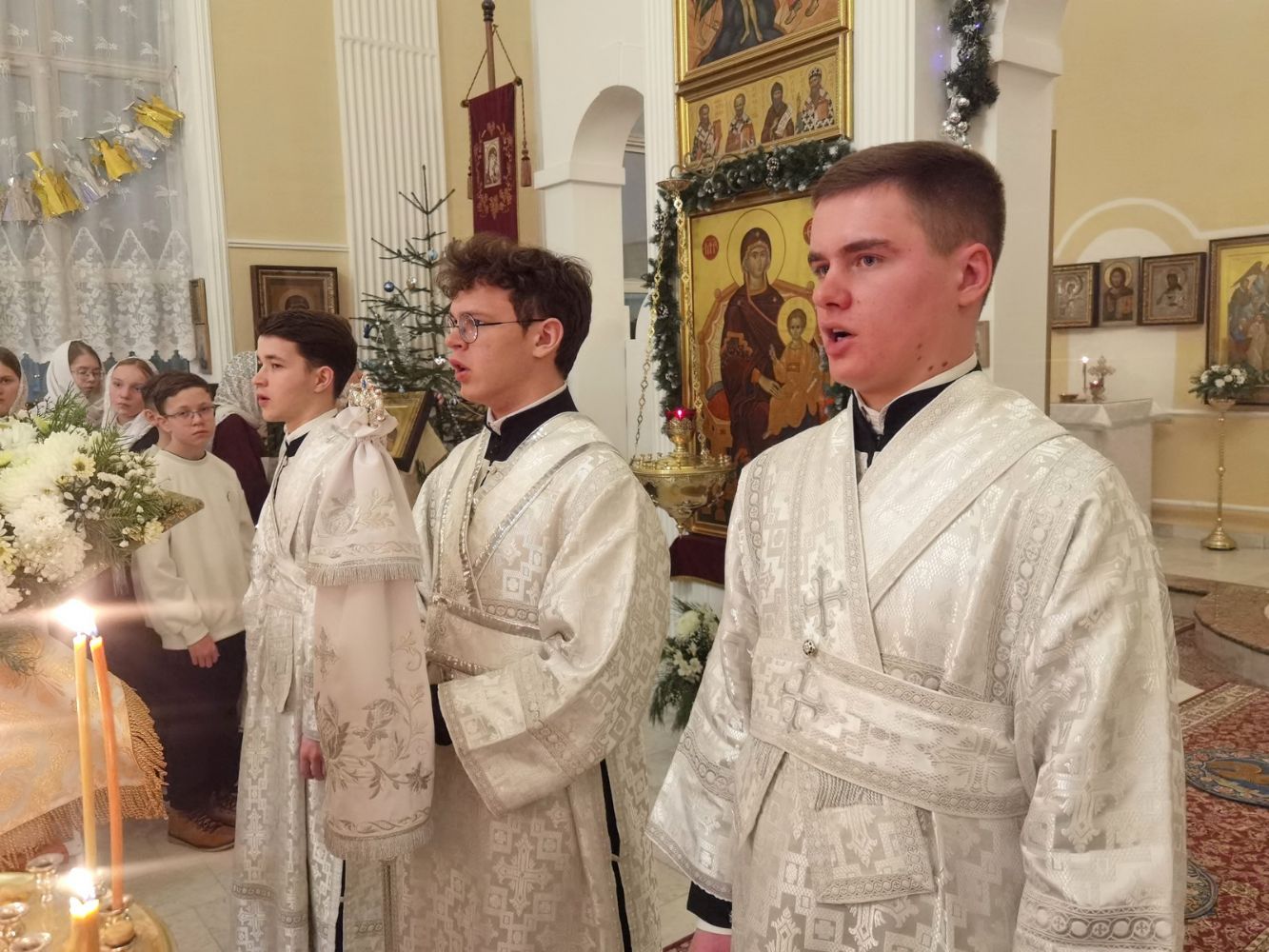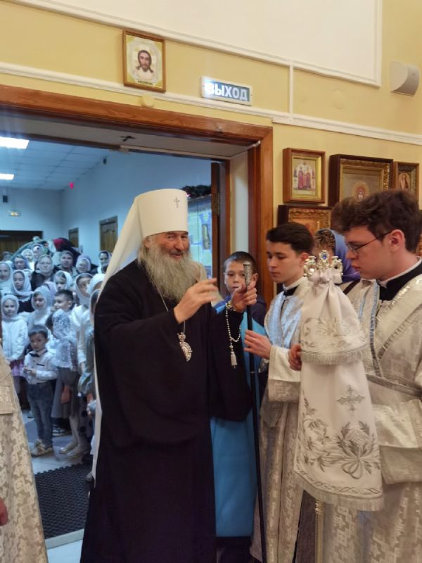 Его Высокопреосвященству сослужили настоятель храма протоиерей Евгений Сурков, клирики храма иерей Андрей Иванов и диакон Никита Сурков, а также клирик храма иконы «Всех скорбящих Радость» иерей Игорь Коваль и протодиакон Михаил Козловский. Песнопения исполняли антифонно архиерейский хор «Благовест» под управлением Софии Андреевой, хор Татианинского храма (регент – Алла Симакова) и детский хор гимназии имени Сергия Радонежского под руководством Анастасии Староверовой.