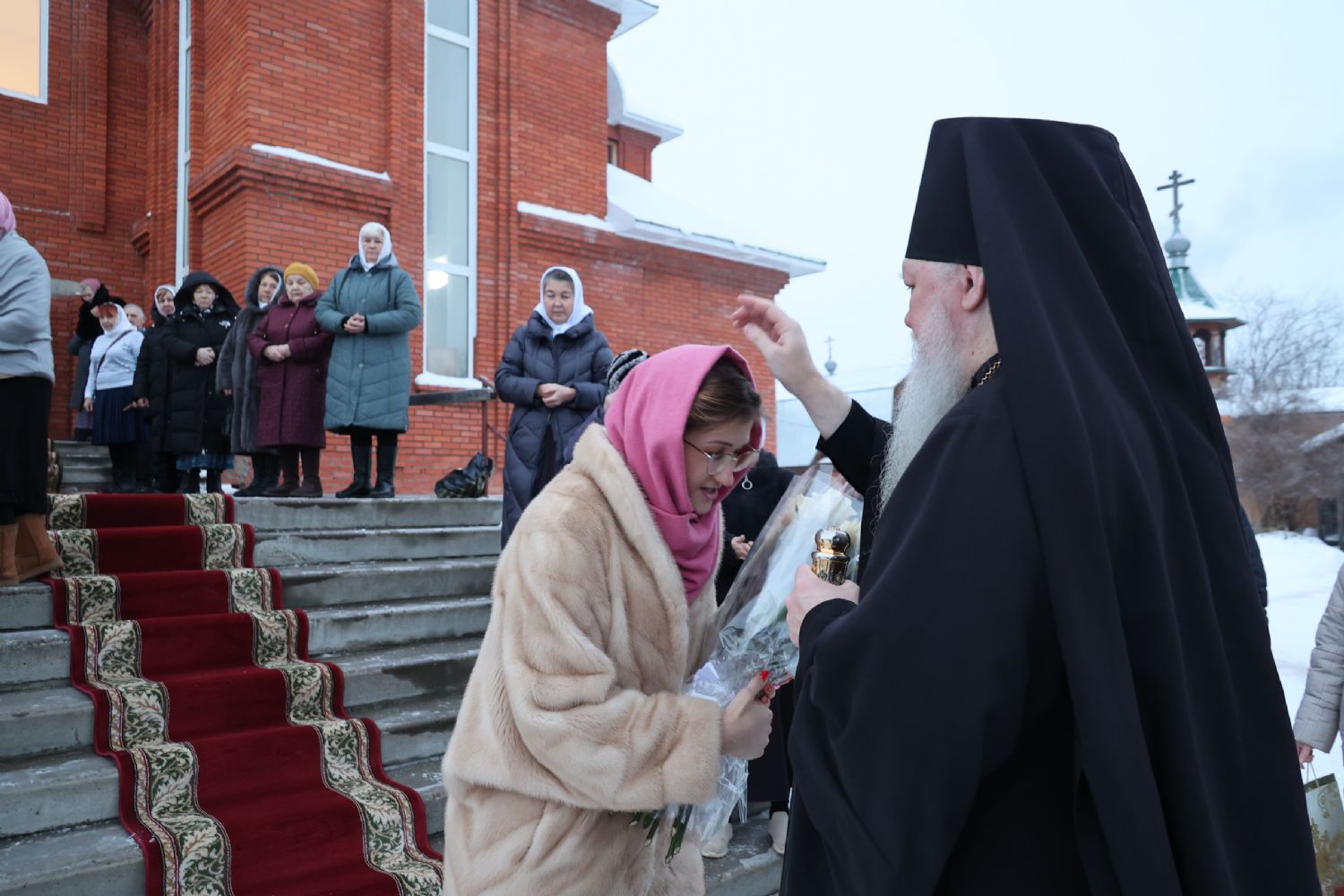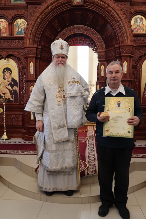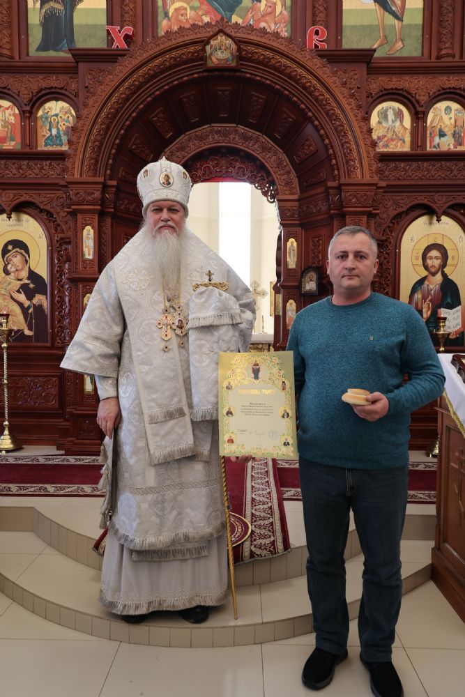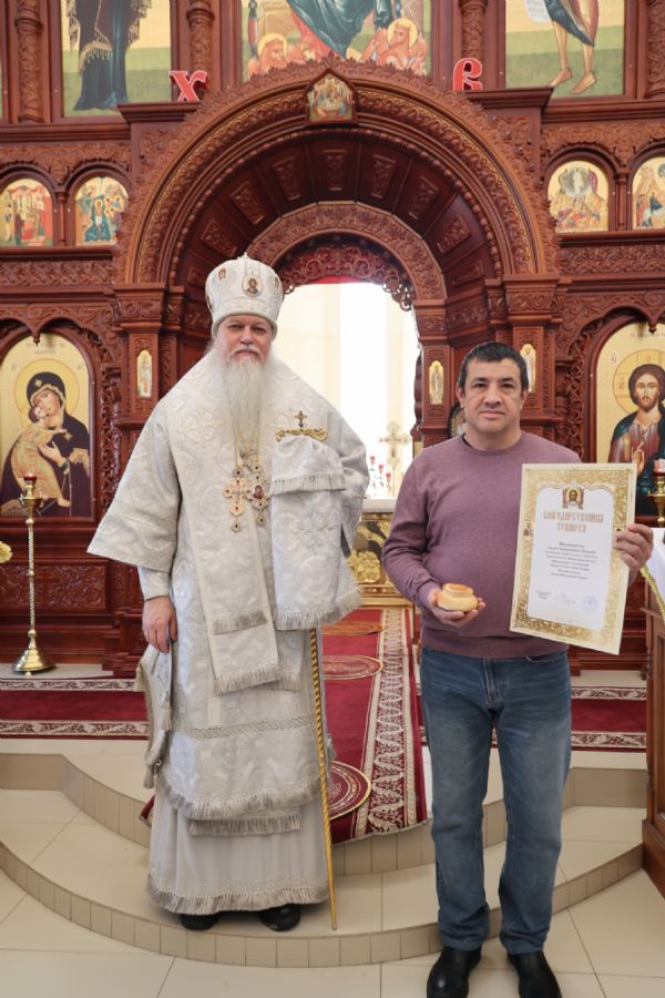 После богослужения епископ Феофан вручил Архиерейские грамоты и Благодарственные письма людям, которые многие годы трудились на благо духовной жизни прихода храма Новомучеников и исповедников Российских.