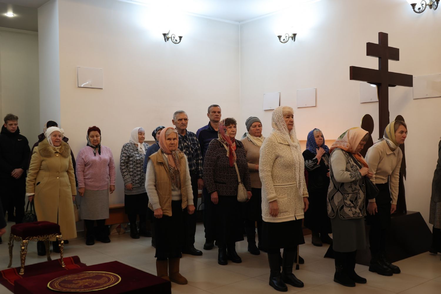 Его Преосвященству сослужили благочинный Волжского церковного округа иерей Алексей Скрябин, настоятель храма иконы Божией Матери «Умягчение злых сердец» д. Полевая иерей Виталий Ульянов, клирики Никольского кафедрального собора г. Волжска иеромонах Александр (Чеборов) и диакон Иоанн Захаров. Песнопения исполняли певчие храма, а также народный хор под управлением Евгения Чигарова.