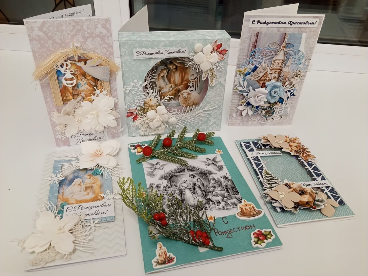 Ольга Петухова "Рождественские открытки в технике скрапбукинг — для бойцов СВО и семей бойцов СВО". Изготовленные открытки переданы для участия в конкурсе Педагогического института МарГУ,и для отправки семьям бойцов СВО,